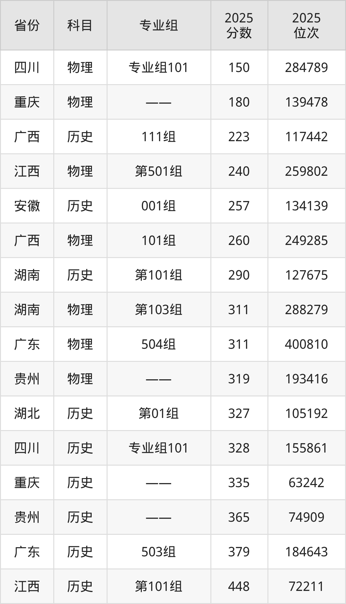 物理类:2025年湘中幼儿师范高等专科学校录取最低分是150分(四川),对应的位次排名是284789名。