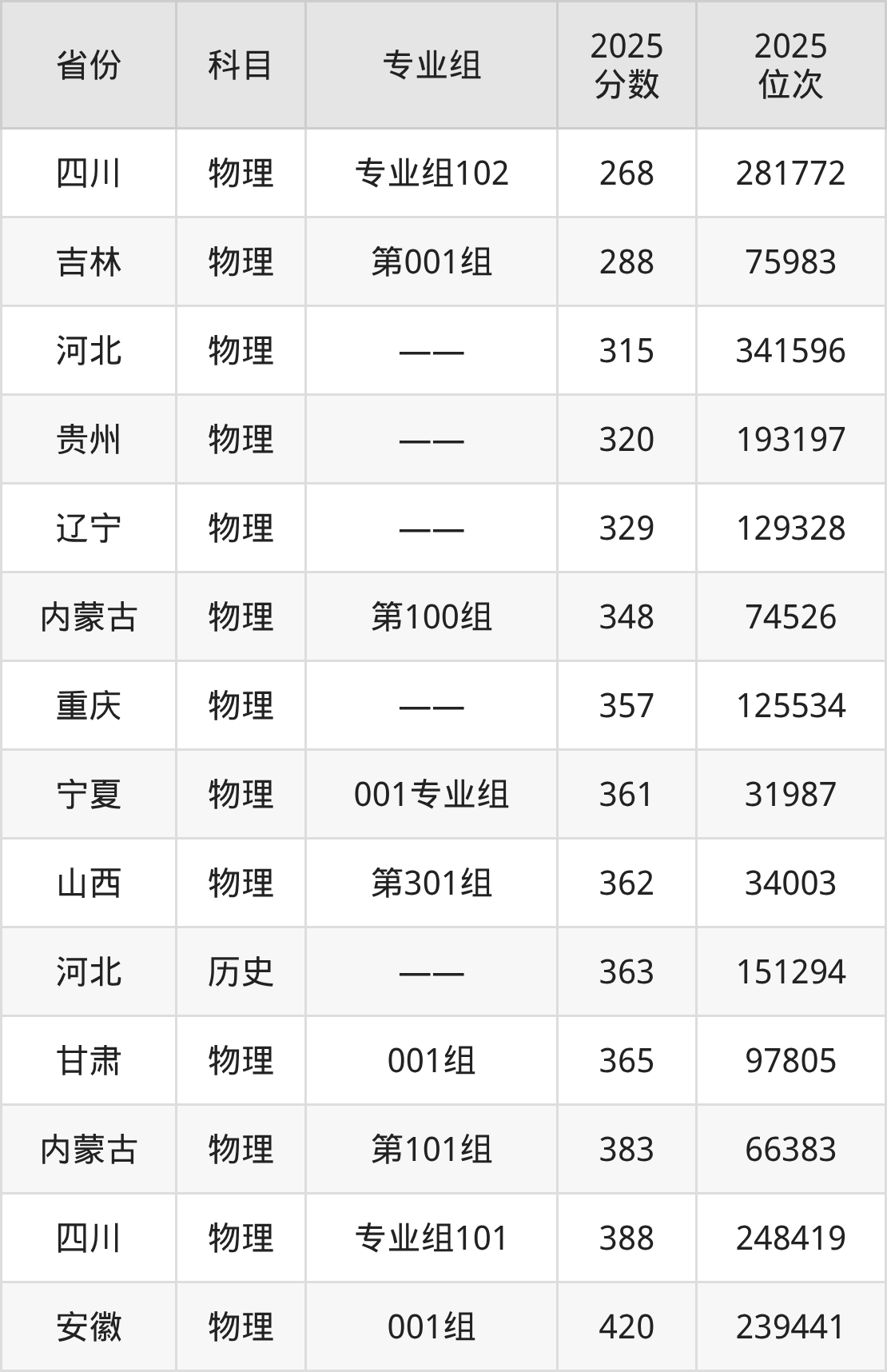 物理类:2025年河北机电职业技术学院录取最低分是268分(四川),对应的位次排名是281772名。