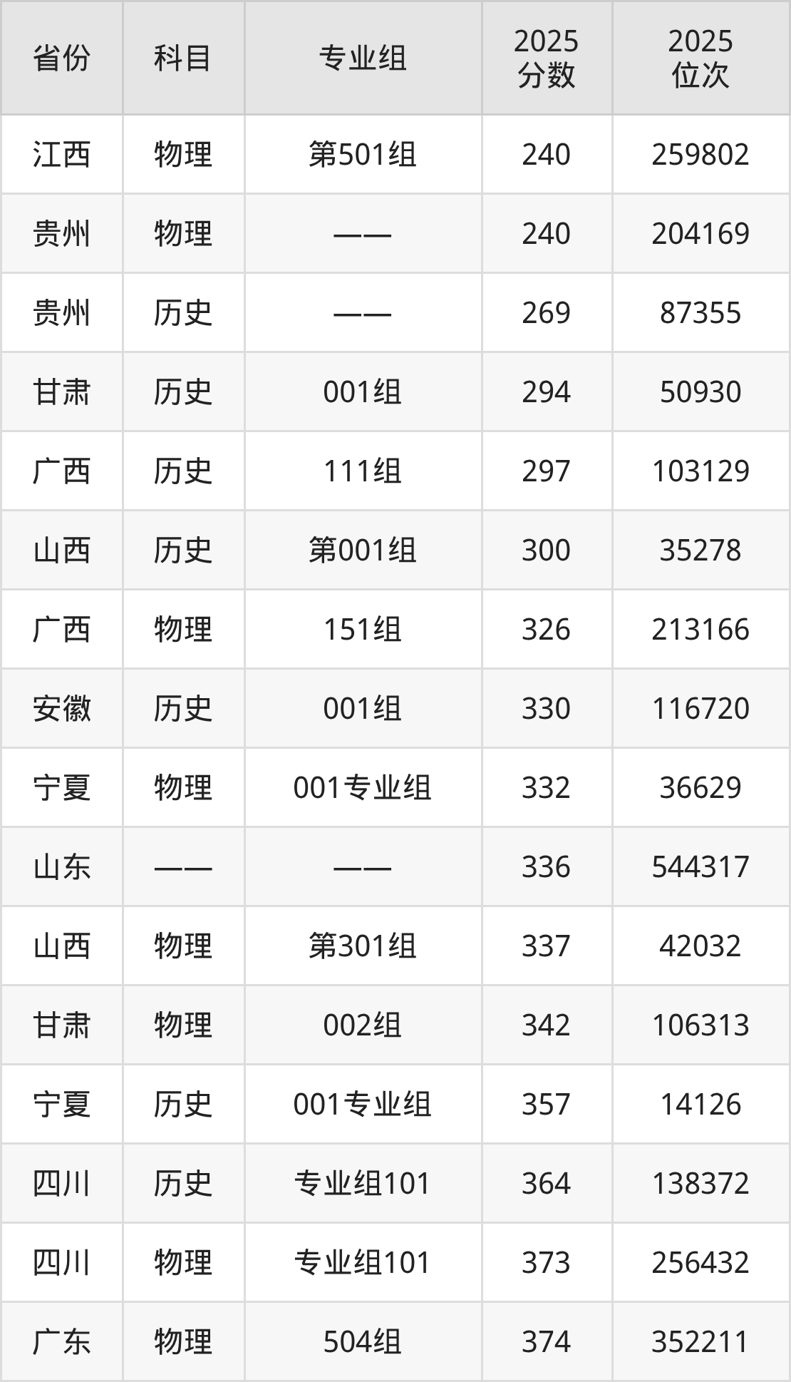 物理类:2025年江西冶金职业技术学院录取最低分是240分(贵州),对应的位次排名是204169名。