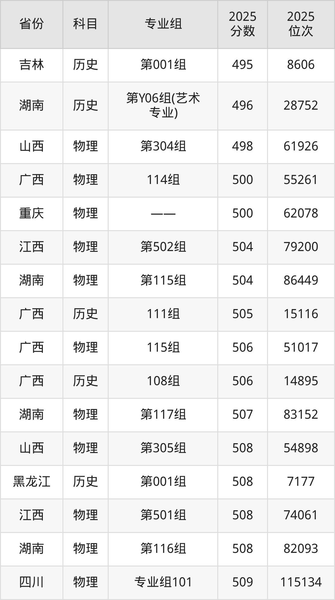 2025年长沙学院全国排名第301位,2025年录取分数线最低410分(位次74946)。本文将展示长沙学院在各省最低录取分数线汇总,供2026届想要报考该校的考生查阅。