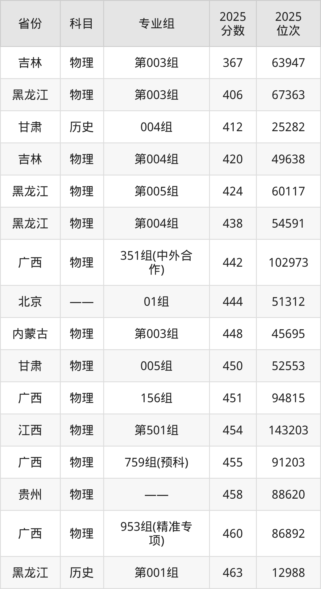 物理类:2025年南宁师范大学录取最低分是367分(吉林),对应的位次排名是63947名。