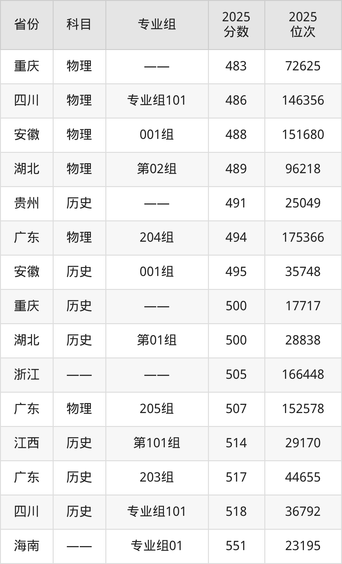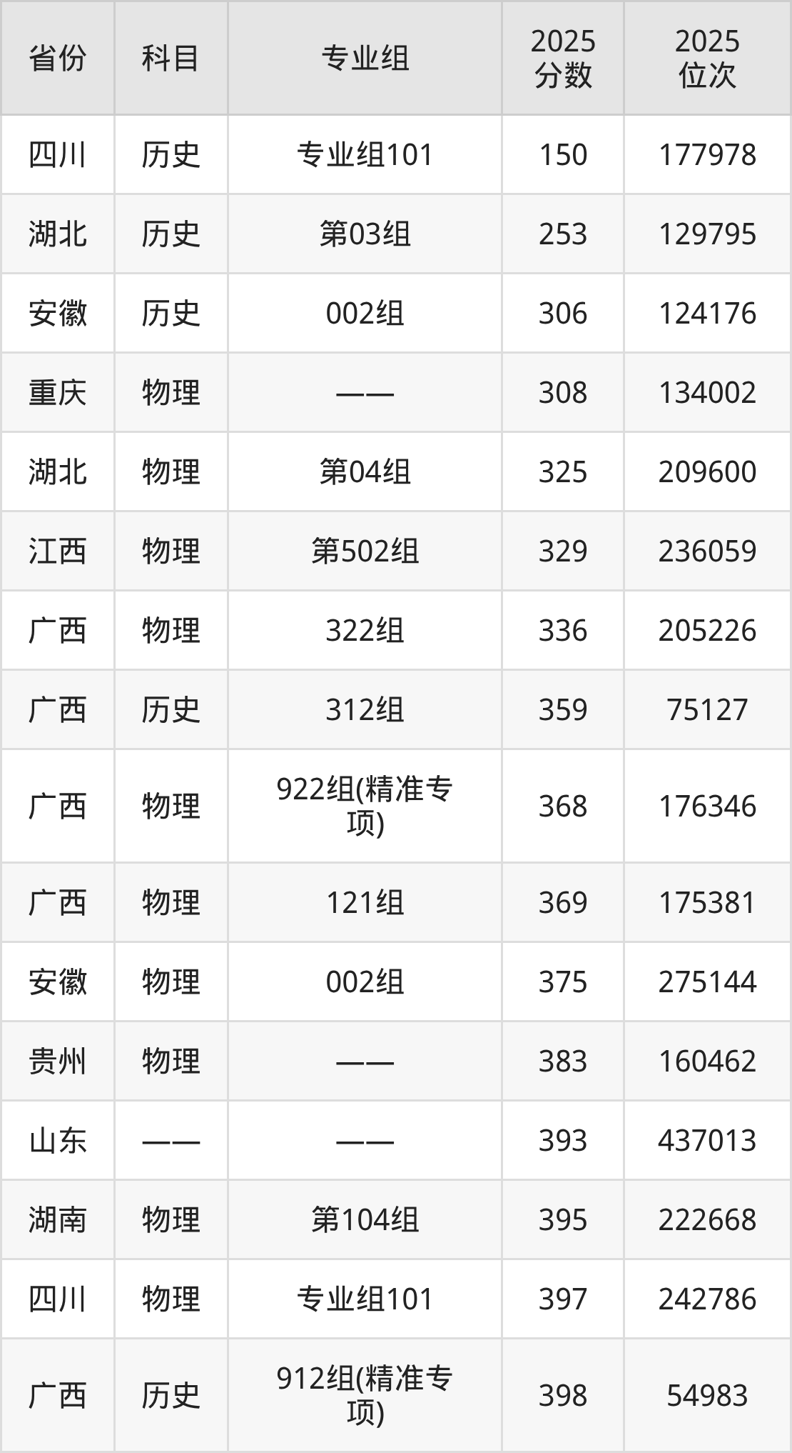 历史类:2025年南宁职业技术大学录取最低分是150分(四川),对应的位次排名是177978名。