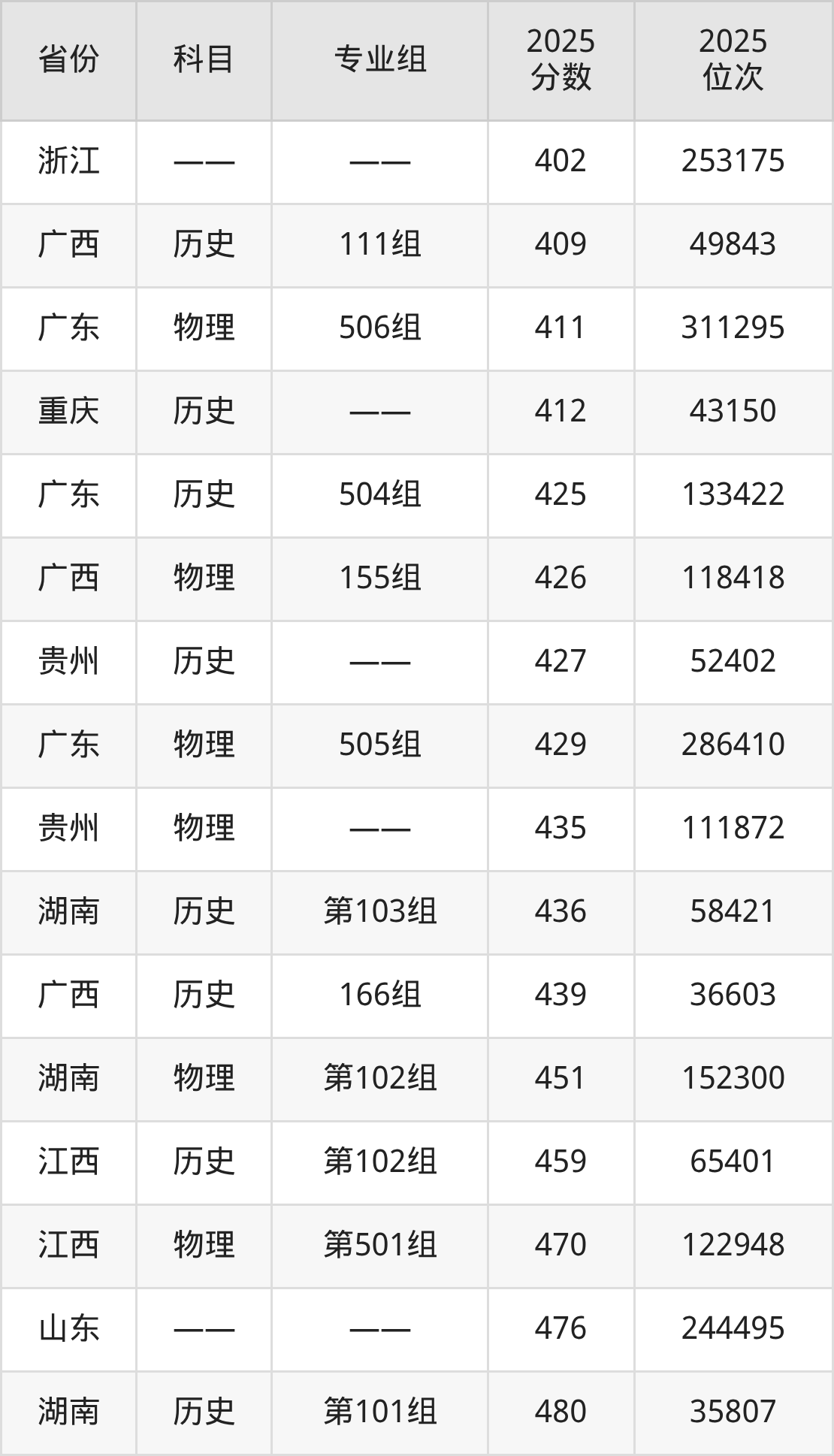 3+3地区:2025年南宁职业技术大学录取最低分是393分(山东),对应的位次排名是437013名。