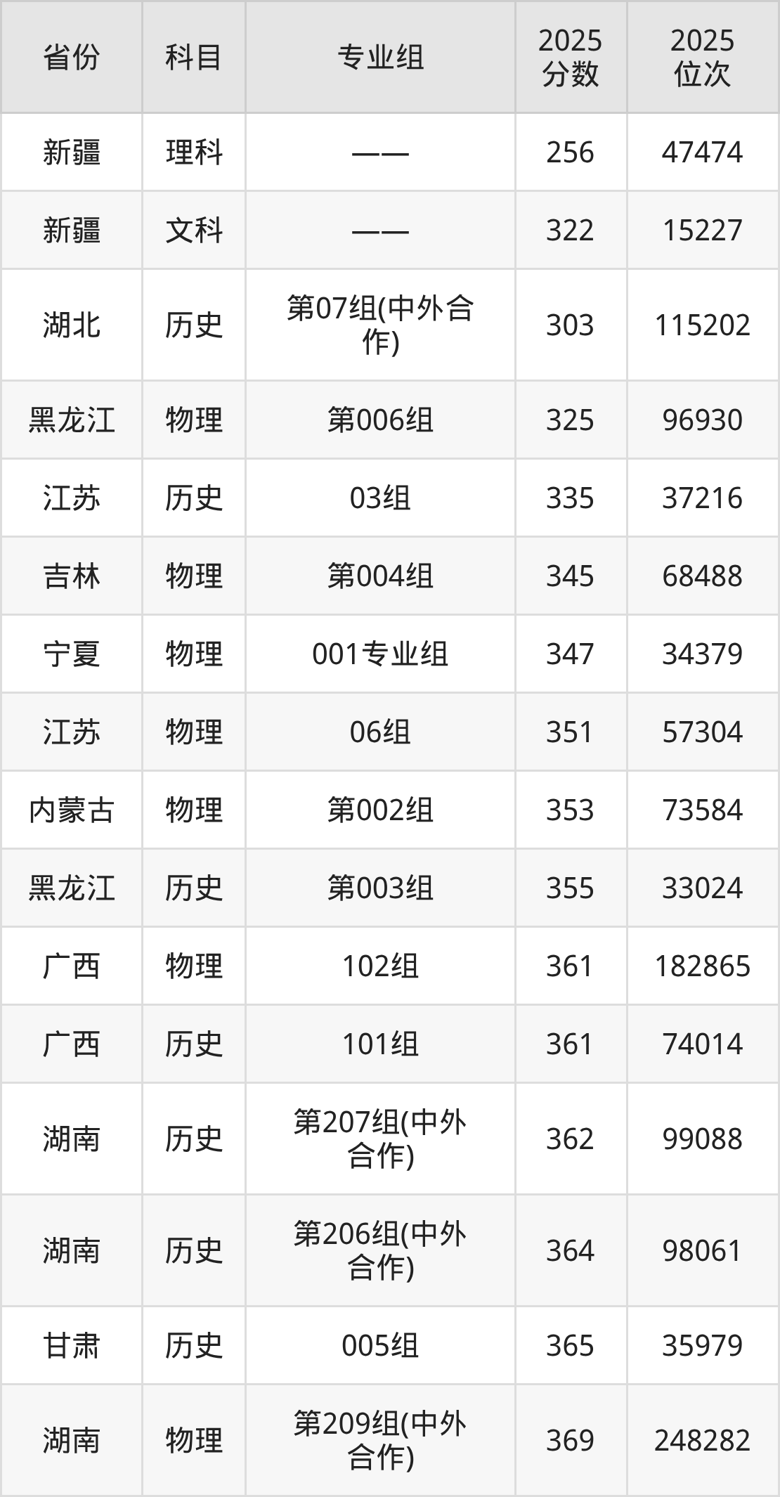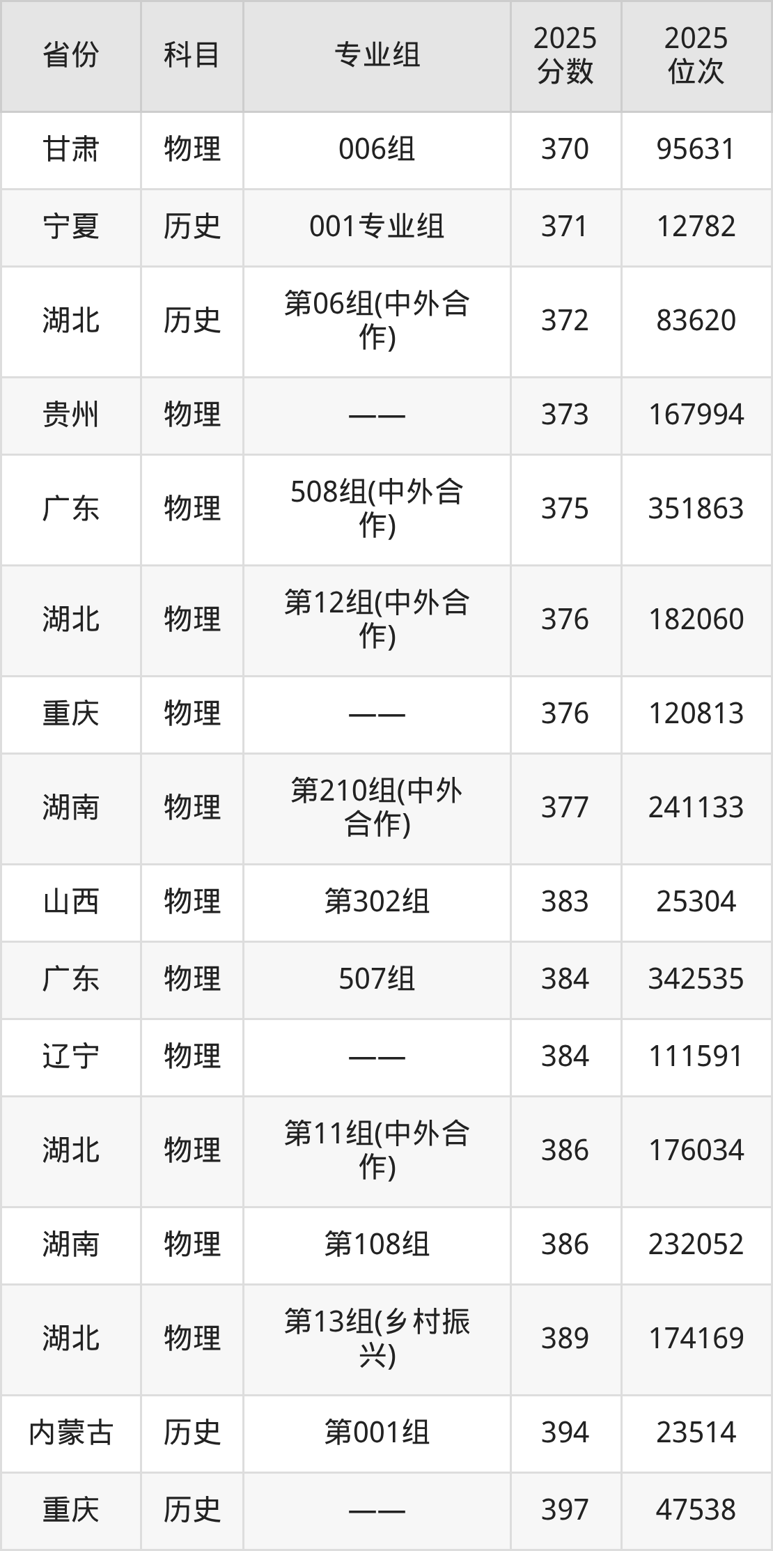 物理类:2025年湖北交通职业技术学院录取最低分是325分(黑龙江),对应的位次排名是96930名。