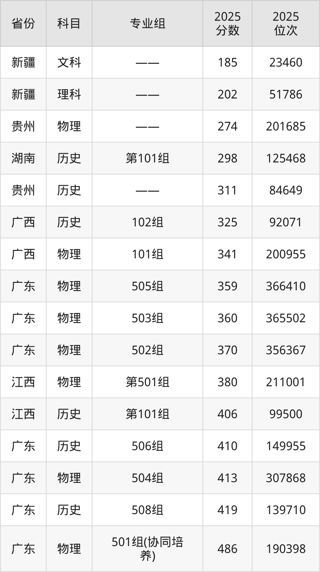 文科:2025年阳江职业技术学院录取最低分是185分(新疆),对应的位次排名是23460名。