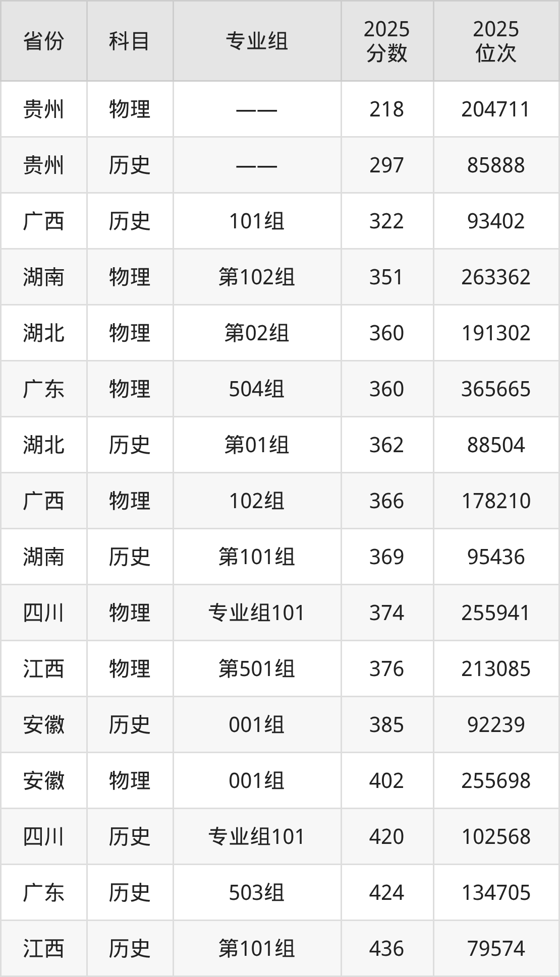 物理类:2025年娄底职业技术学院录取最低分是218分(贵州),对应的位次排名是204711名。