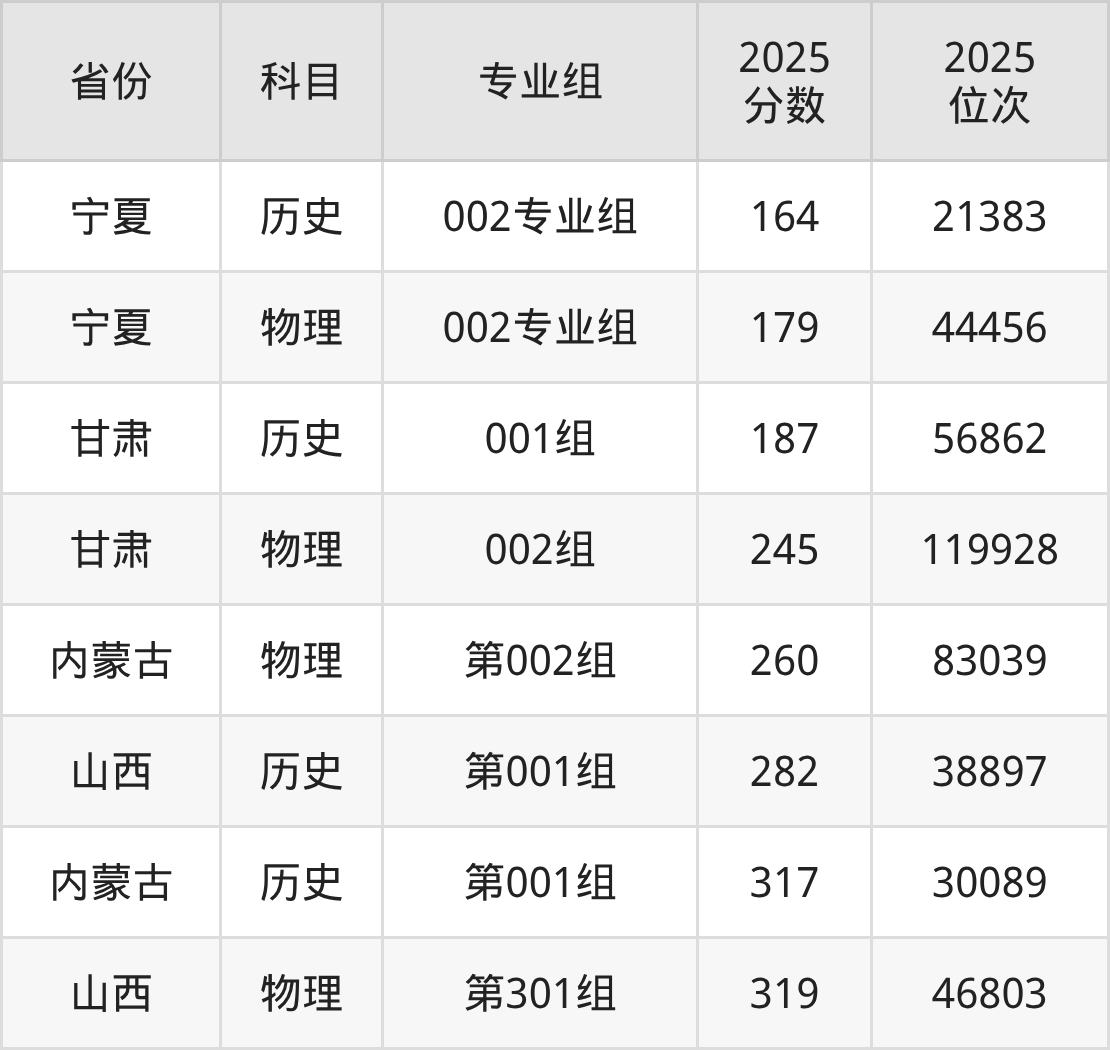 历史类:2025年宁夏葡萄酒与防沙治沙职业技术学院回族自治区内录取最低分是164分,对应的位次排名是21383名。建议:如果2026年排名超过21383名,那么被该校录取的概率较大。