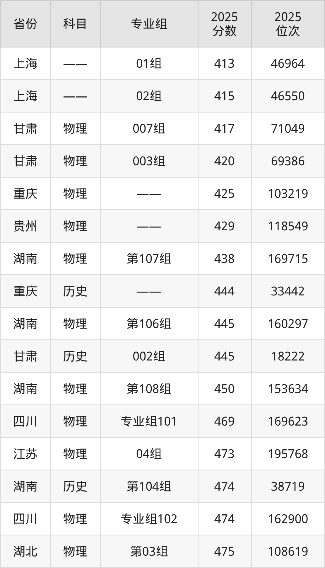 物理类:2025年重庆城市科技学院录取最低分是417分(甘肃),对应的位次排名是71049名。