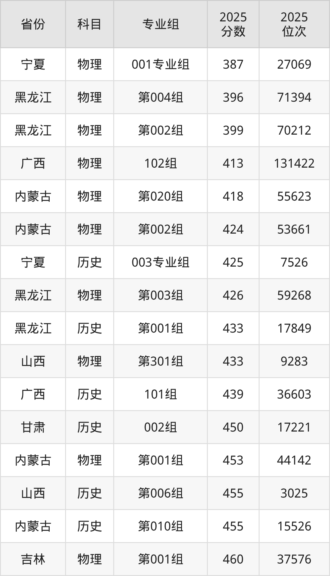 物理类:2025年张家口学院录取最低分是387分(宁夏),对应的位次排名是27069名。