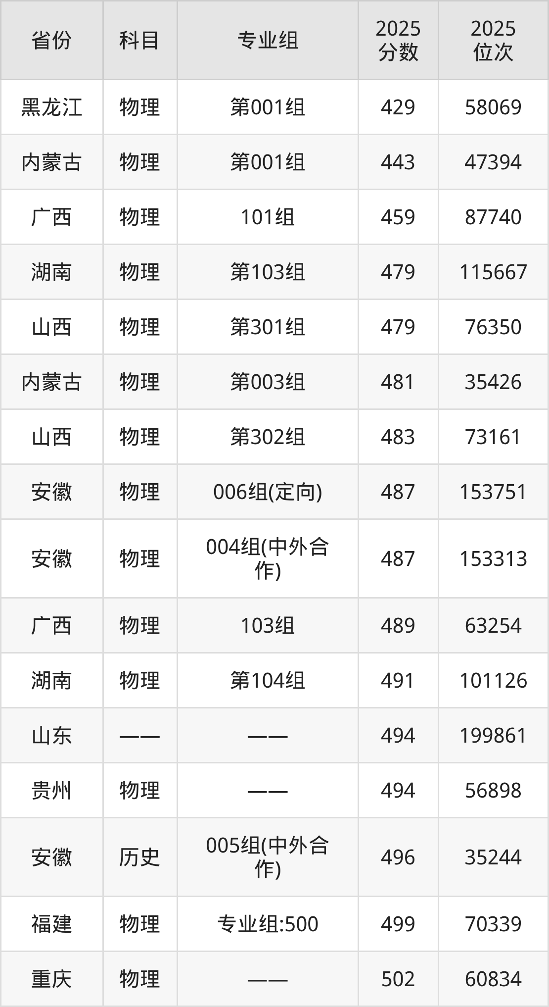 物理类:2025年阜阳师范大学省内录取最低分是487分,对应的位次排名是153751名。建议:如果2026年排名超过153751名,那么被该校录取的概率较大。