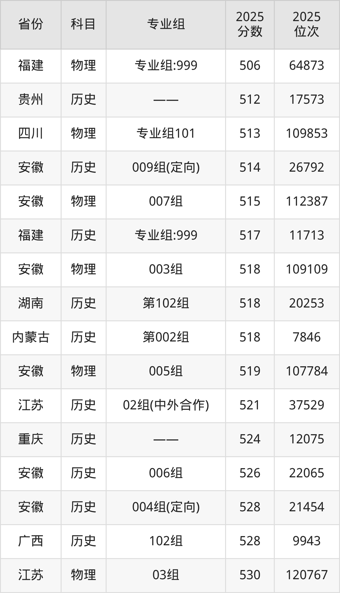 历史类:2025年阜阳师范大学省内录取最低分是496分,对应的位次排名是35244名。建议:如果2026年排名超过35244名,那么被该校录取的概率较大。