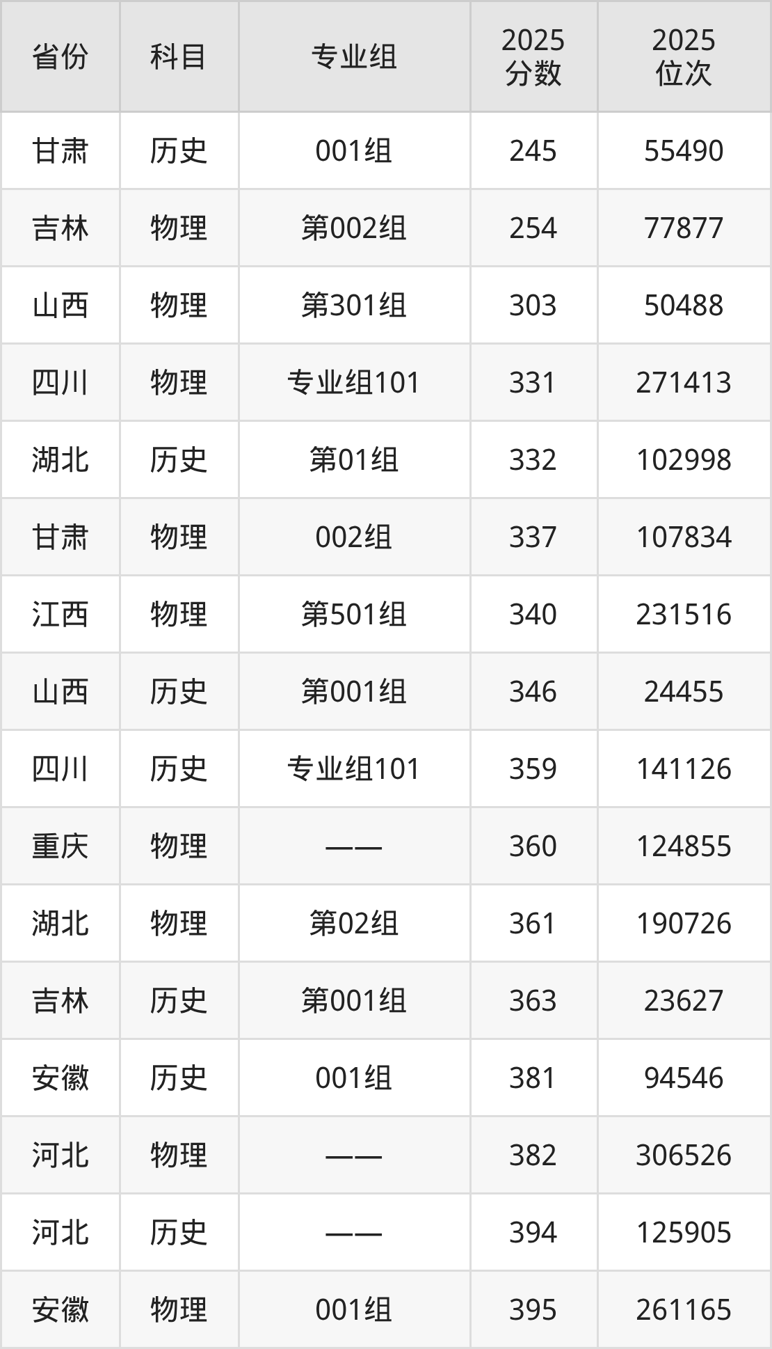 物理类:2025年邯郸职业技术学院录取最低分是254分(吉林),对应的位次排名是77877名。