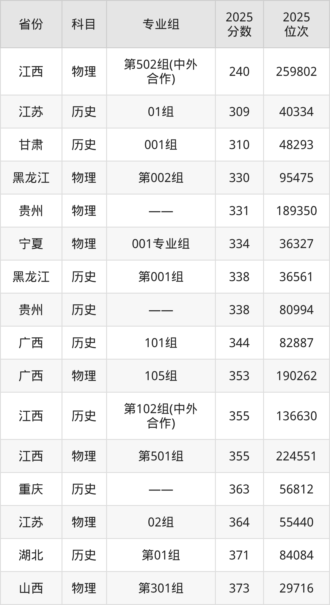 物理类:2025年江西机电职业技术学院录取最低分是330分(黑龙江),对应的位次排名是95475名。