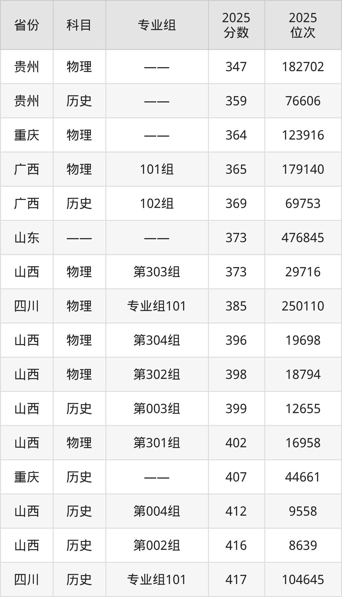 物理类:2025年贵阳职业技术学院录取最低分是364分(重庆),对应的位次排名是123916名。
