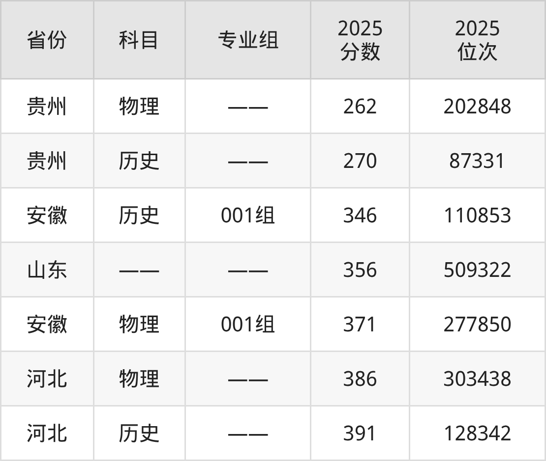 物理类:2025年六安职业技术学院录取最低分是262分(贵州),对应的位次排名是202848名。