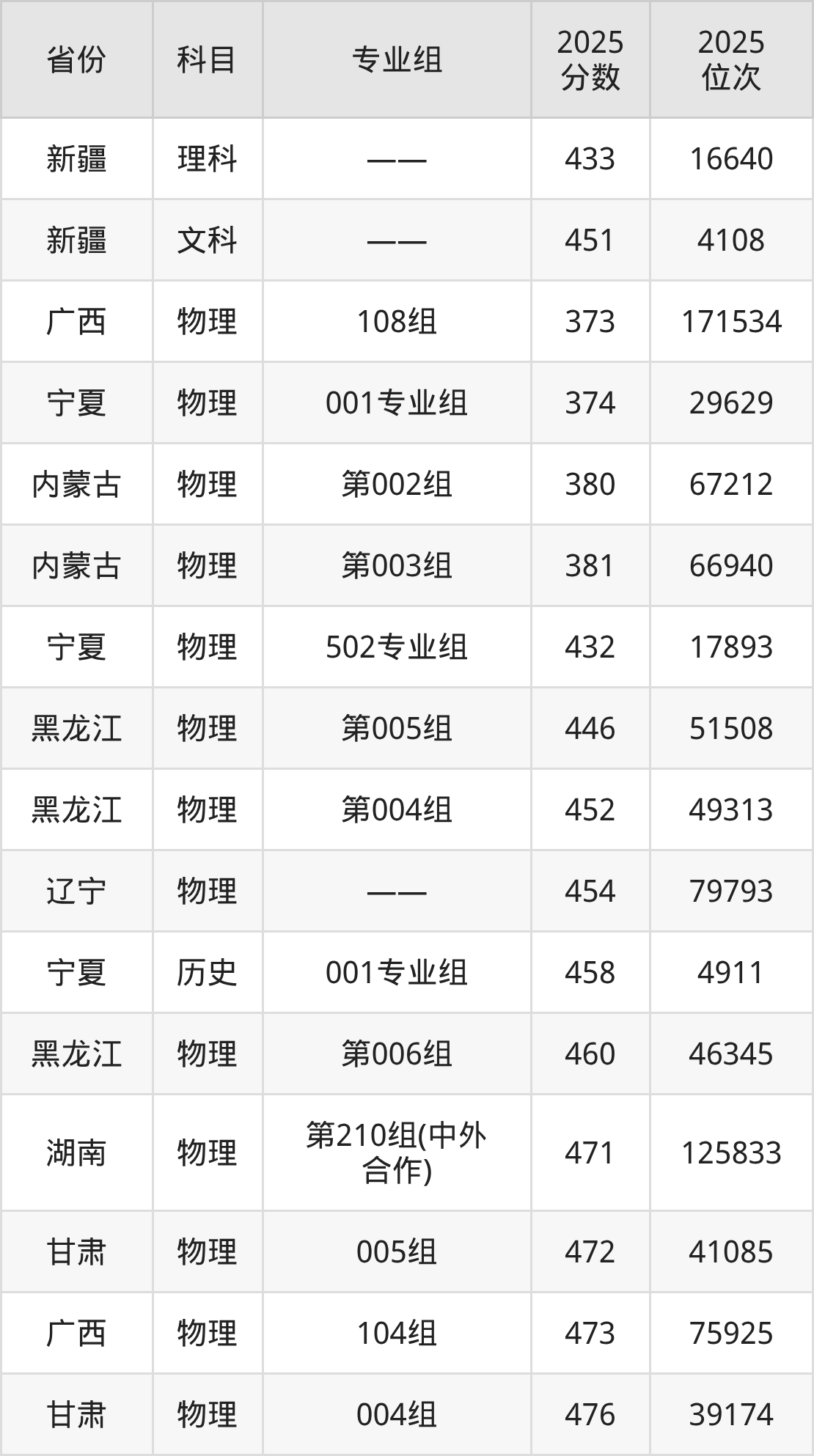 理科:2025年中南林业科技大学录取最低分是433分(新疆),对应的位次排名是16640名。