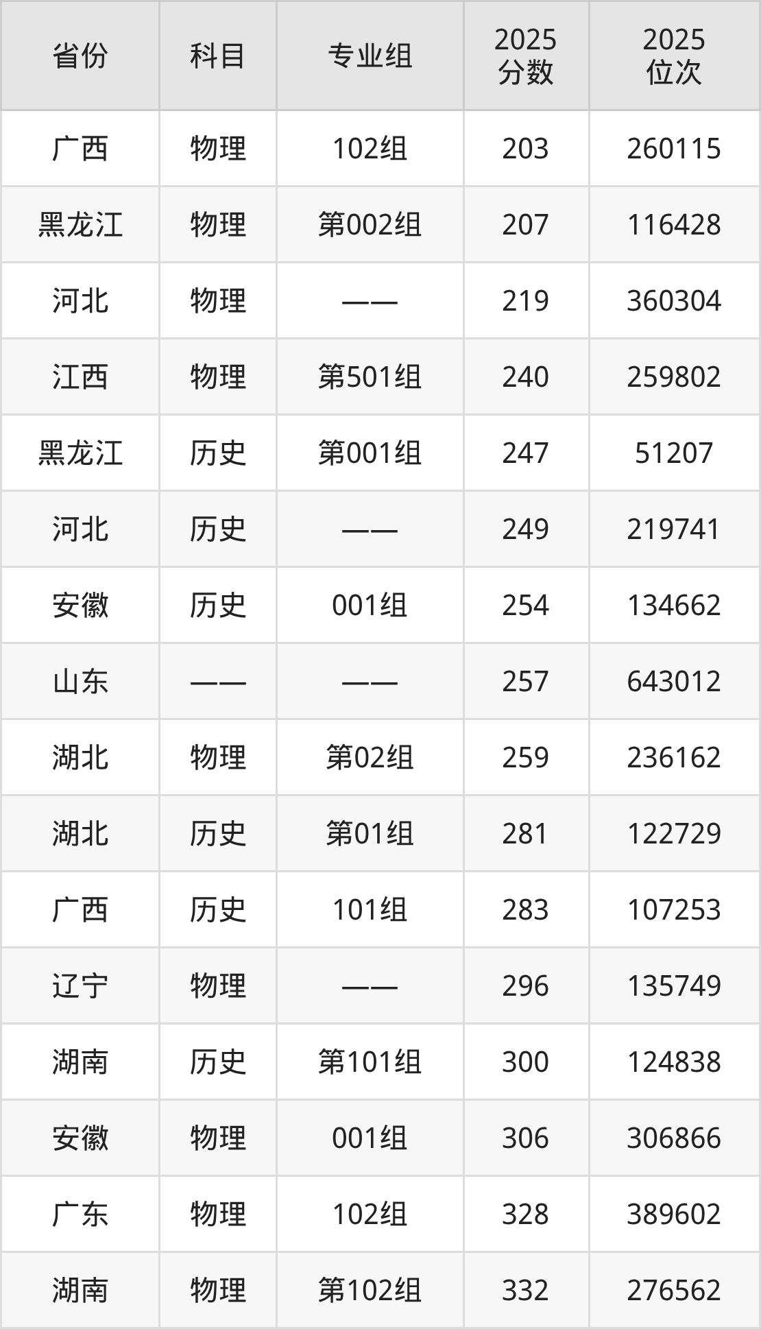 物理类:2025年厦门东海职业技术学院录取最低分是203分(广西),对应的位次排名是260115名。