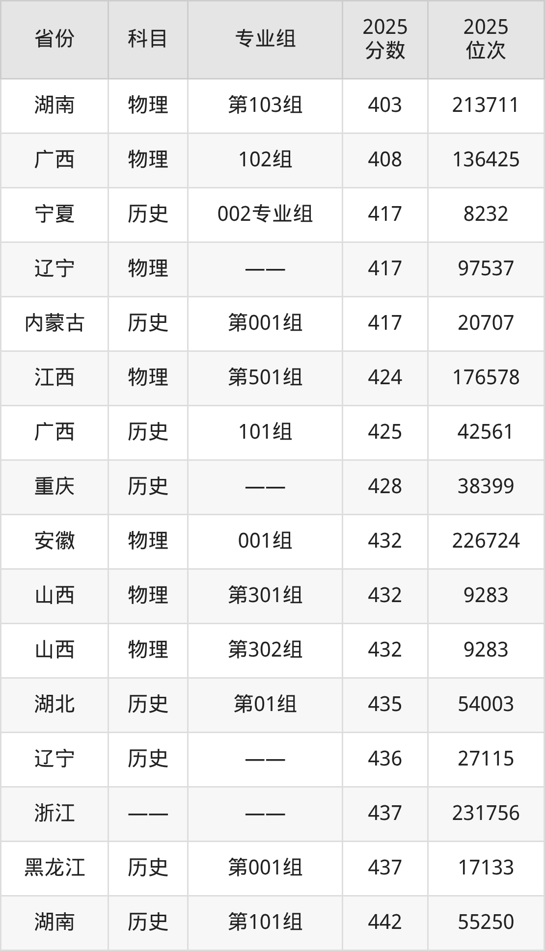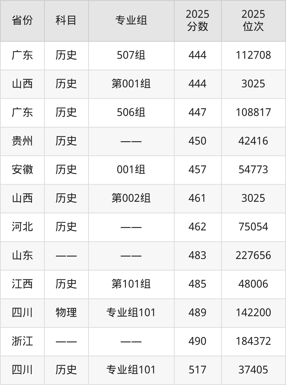 3+3地区:2025年重庆城市管理职业学院录取最低分是437分(浙江),对应的位次排名是231756名。