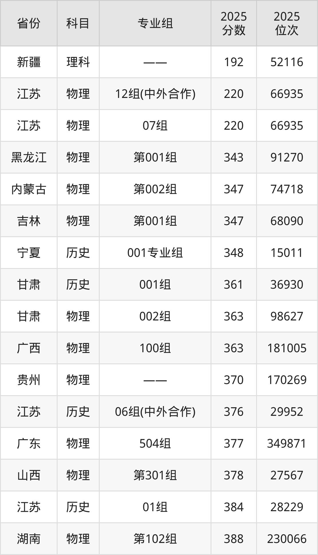 理科:2025年江苏食品药品职业技术学院录取最低分是192分(新疆),对应的位次排名是52116名。