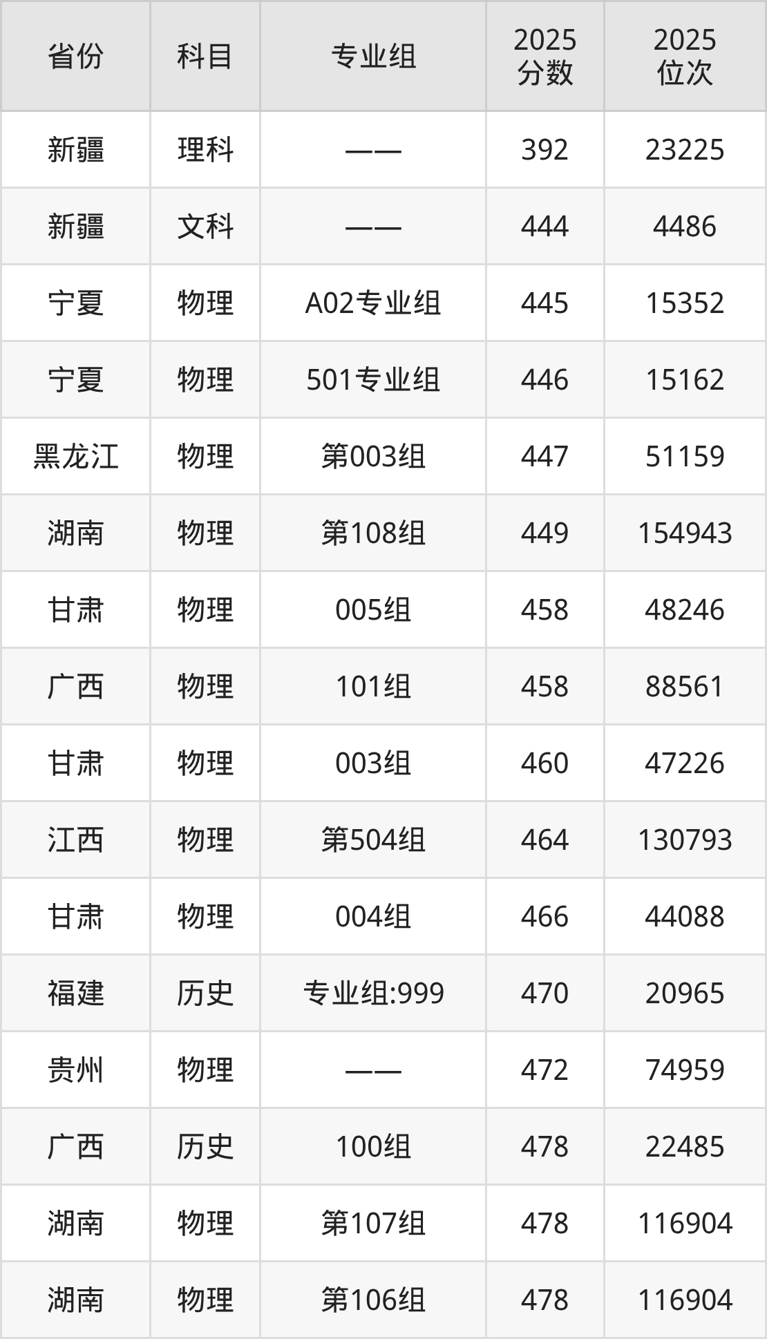 2025年西安文理学院全国排名第441位,2025年录取分数线最低392分(位次23225)。本文将展示西安文理学院在各省最低录取分数线汇总,供2026届想要报考该校的考生查阅。