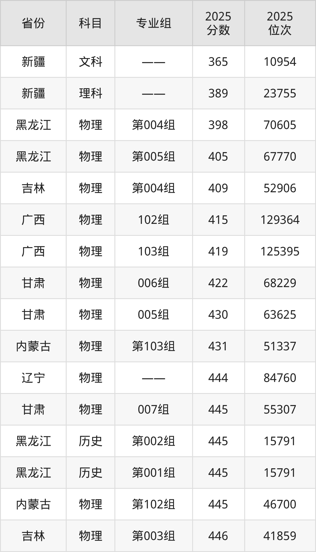 理科:2025年长治学院录取最低分是389分(新疆),对应的位次排名是23755名。
