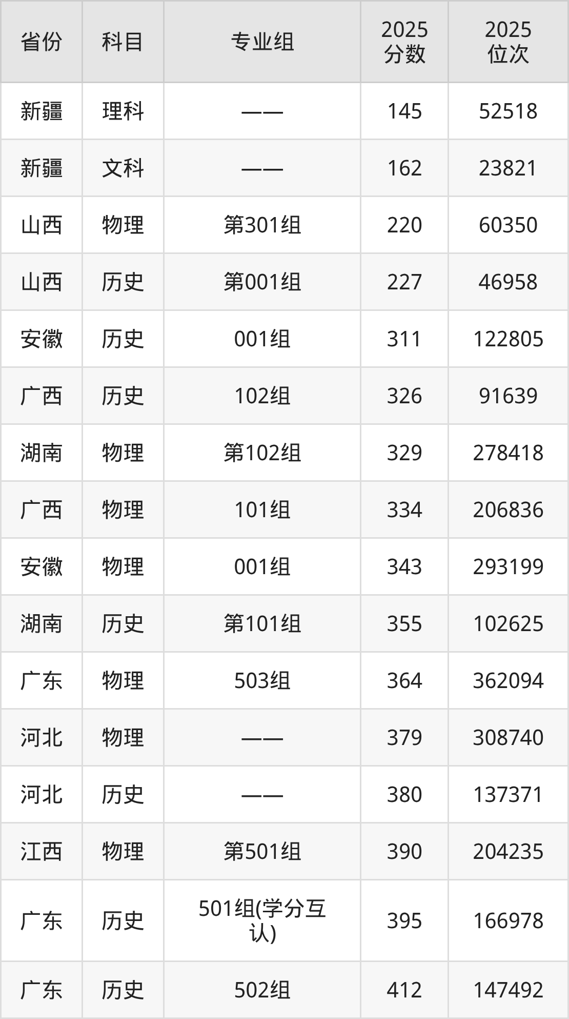 理科:2025年汕头职业技术学院录取最低分是145分(新疆),对应的位次排名是52518名。