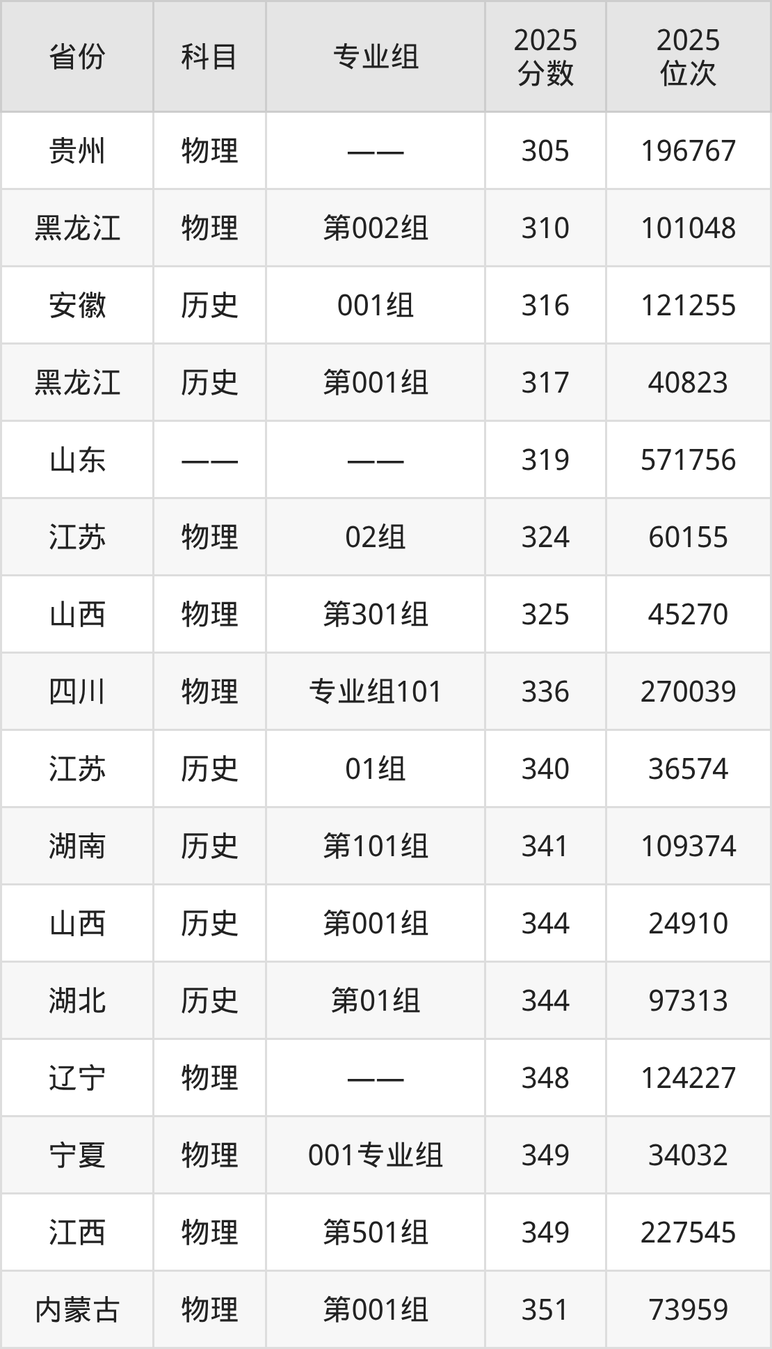 物理类:2025年山东化工职业学院录取最低分是305分(贵州),对应的位次排名是196767名。