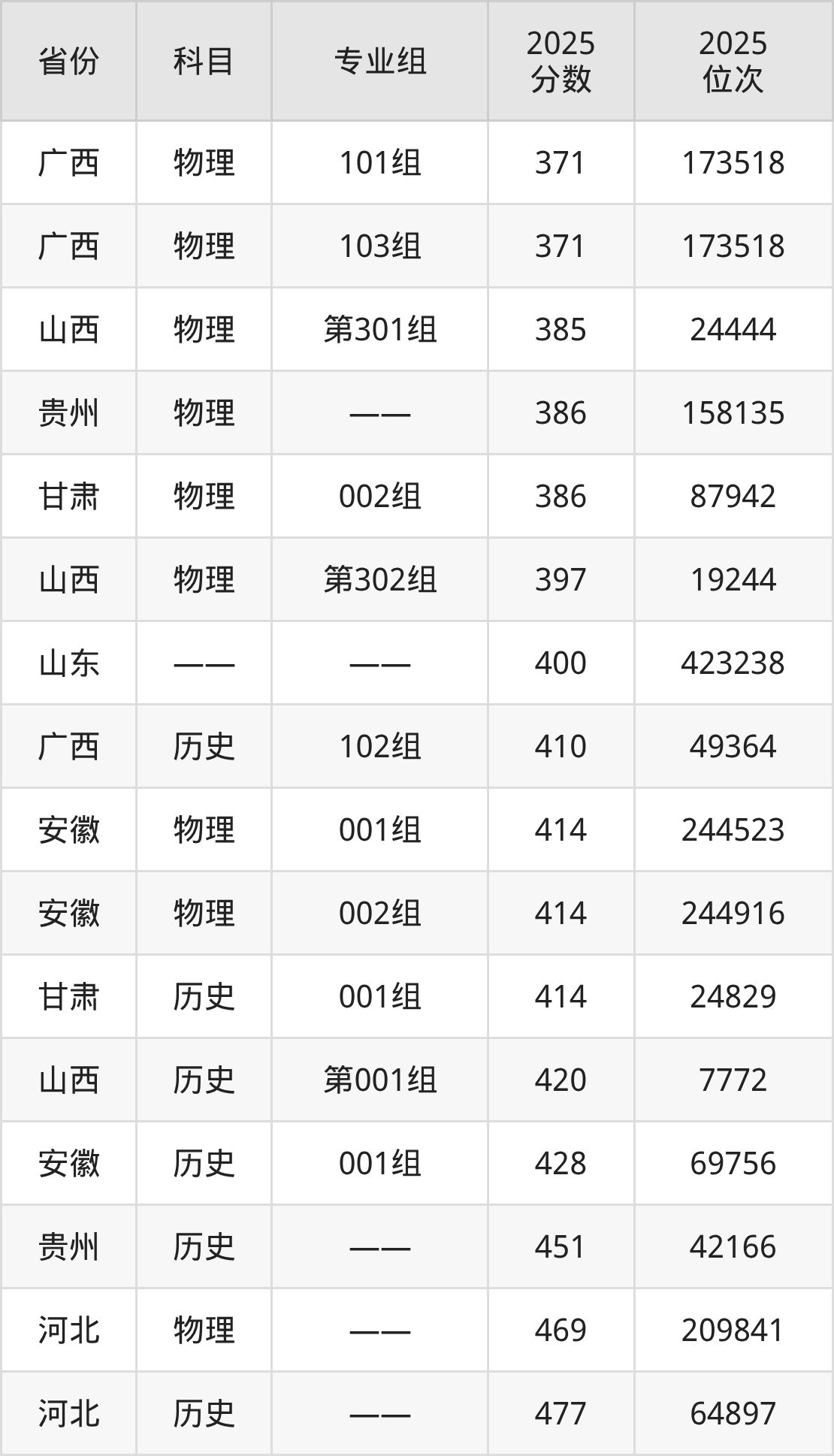 物理类:2025年菏泽医学专科学校录取最低分是371分(广西),对应的位次排名是173518名。