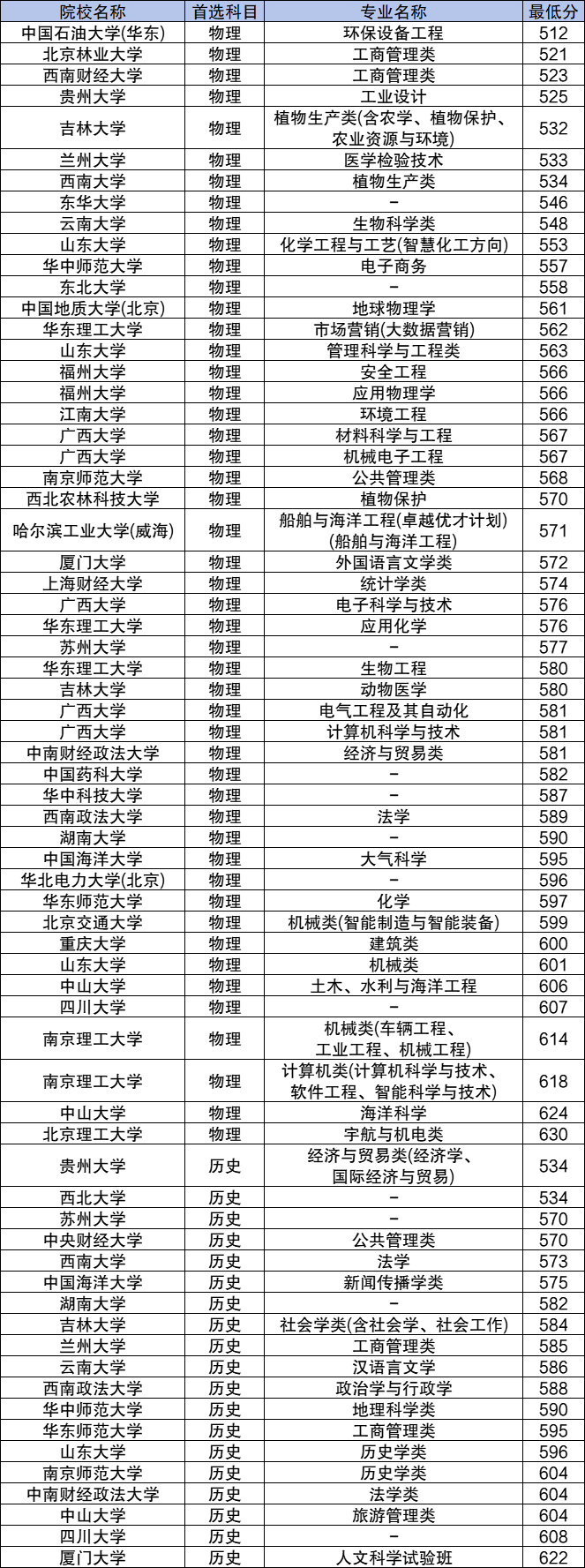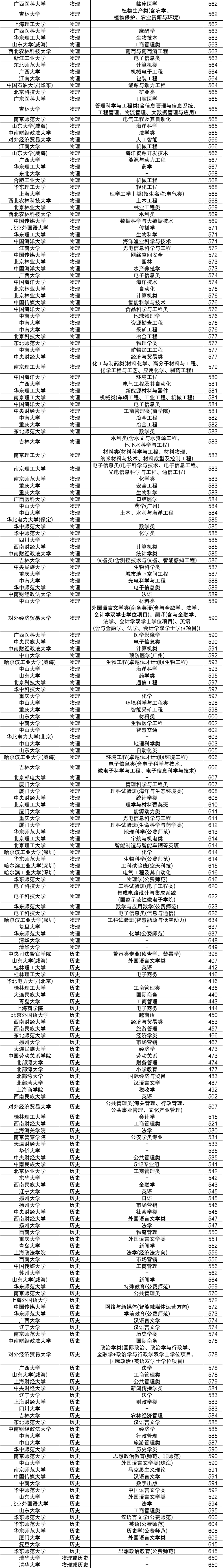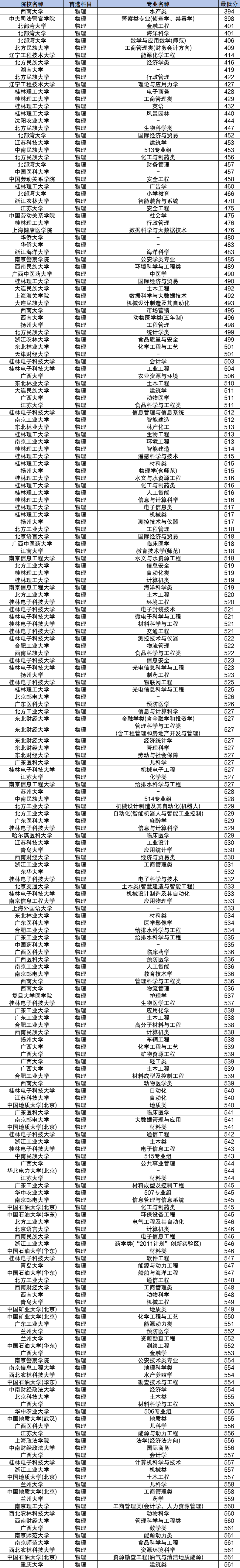 物理类收分最低的是北部湾大学(金融工程);历史类收分最低的是桂林理工大学(英语)。