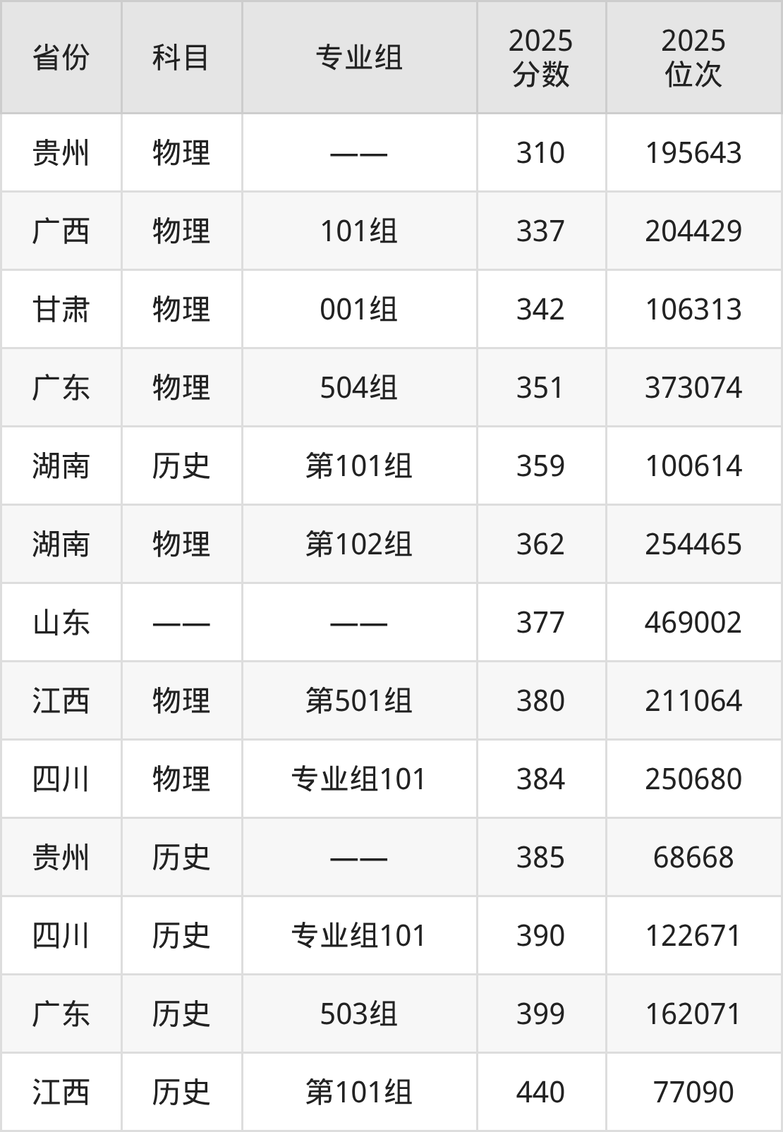 物理类:2025年湖南有色金属职业技术学院录取最低分是310分(贵州),对应的位次排名是195643名。