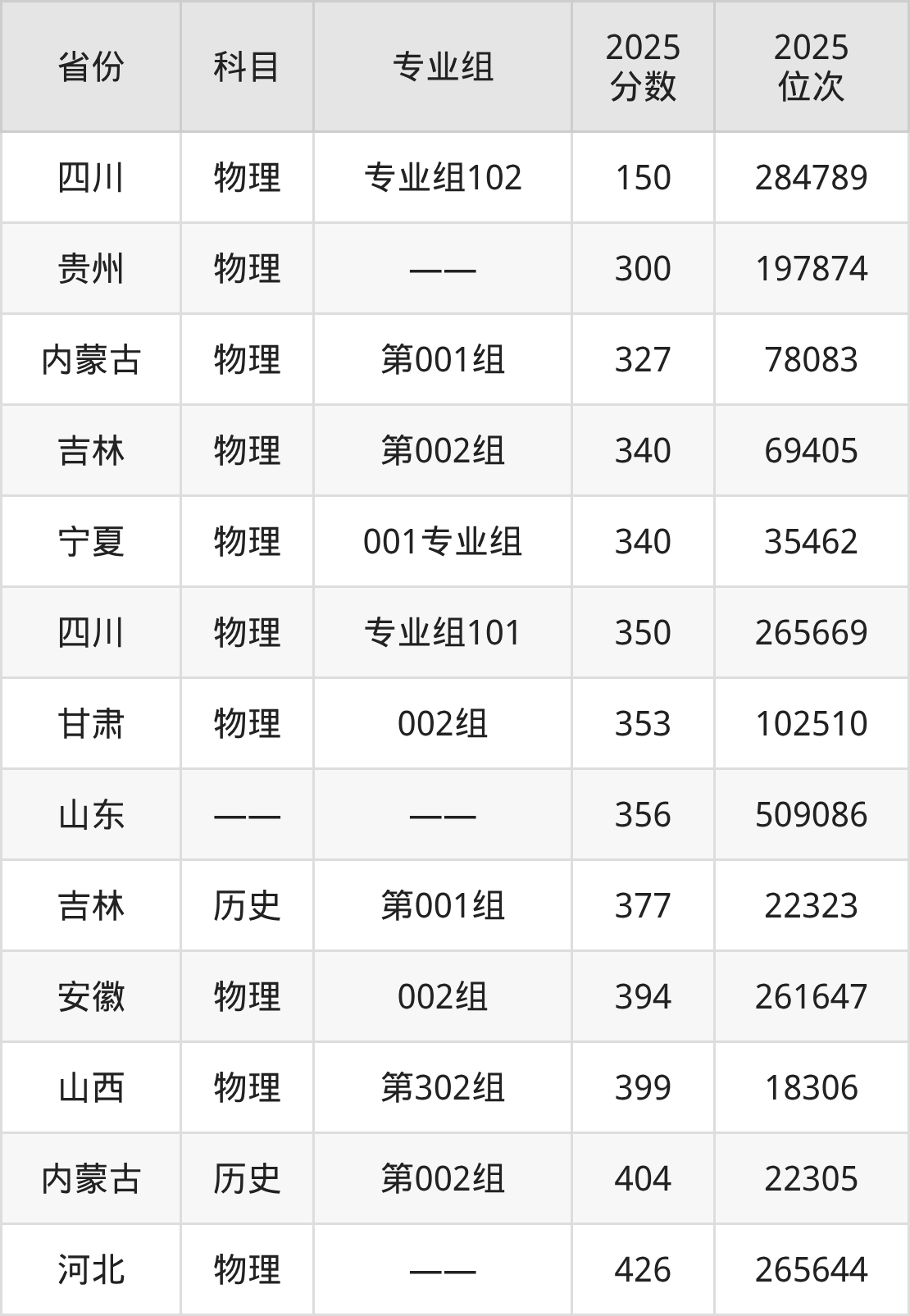物理类:2025年山东交通职业学院录取最低分是150分(四川),对应的位次排名是284789名。
