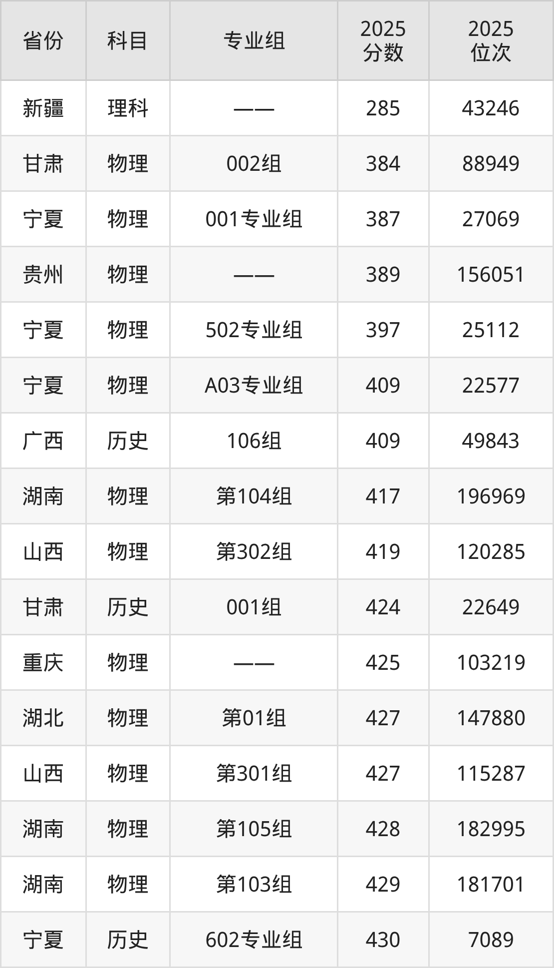 物理类:2025年延安大学西安创新学院录取最低分是384分(甘肃),对应的位次排名是88949名。