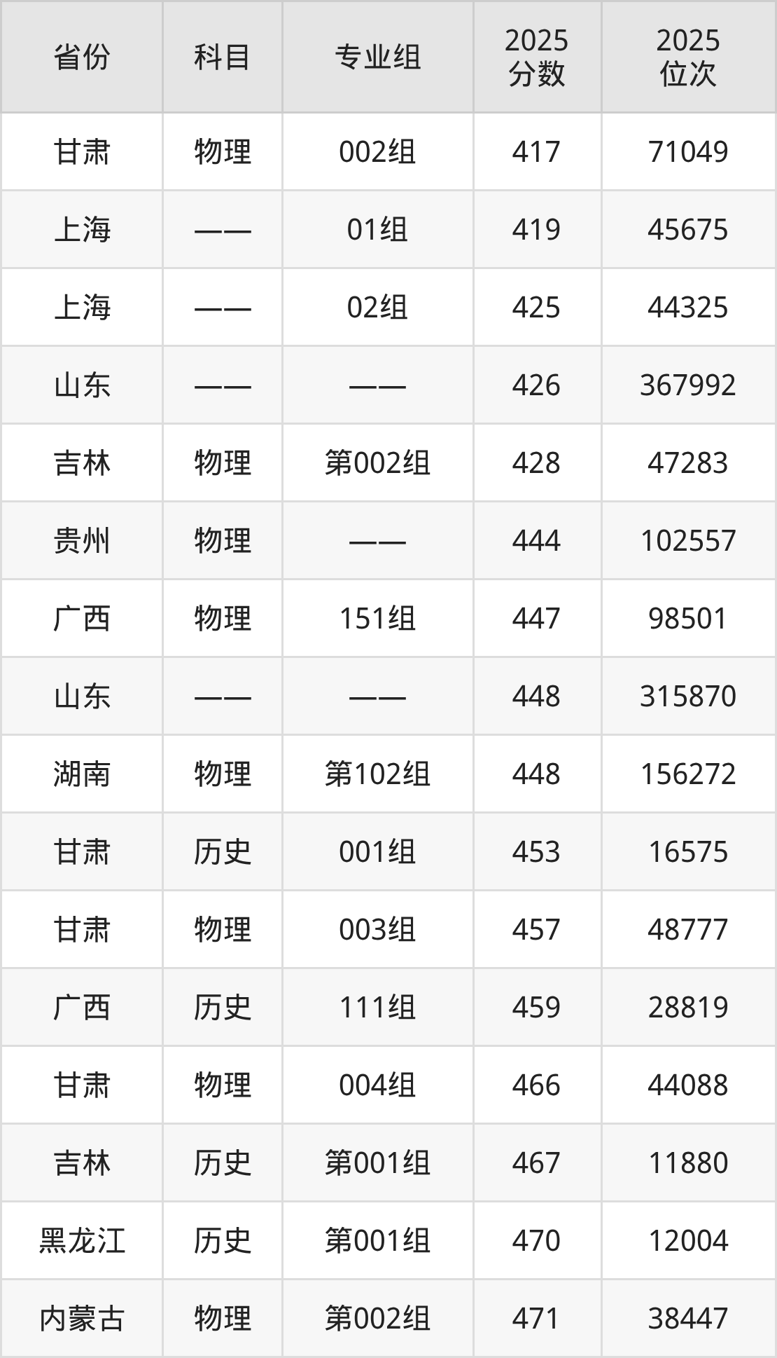 物理类:2025年济宁学院录取最低分是417分(甘肃),对应的位次排名是71049名。