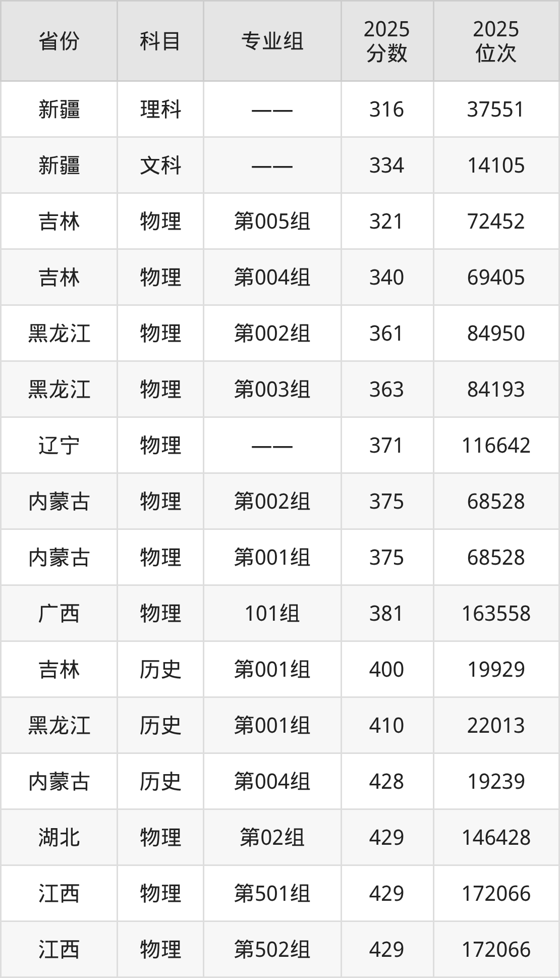 理科:2025年吉林建筑科技学院录取最低分是316分(新疆),对应的位次排名是37551名。
