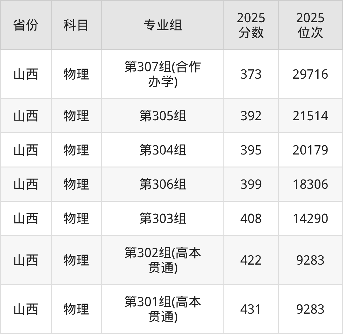 物理类:2025年山西电力职业技术学院省内录取最低分是373分,对应的位次排名是29716名。建议:如果2026年排名超过29716名,那么被该校录取的概率较大。