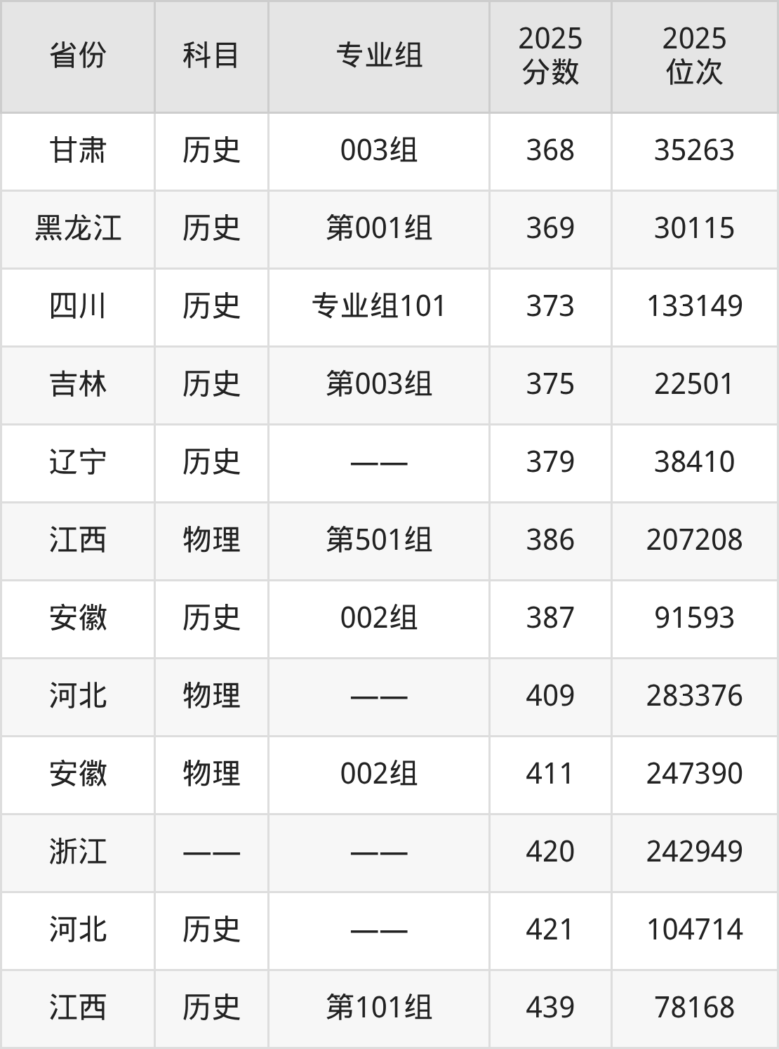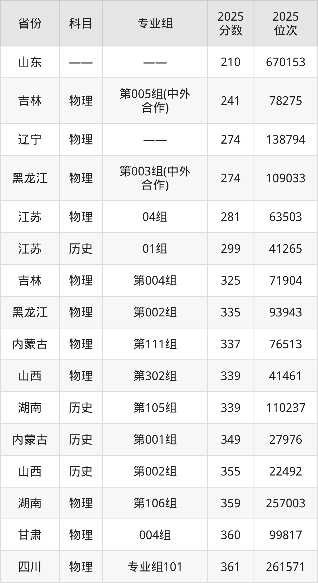 物理类:2025年威海职业学院录取最低分是241分(吉林),对应的位次排名是78275名。
