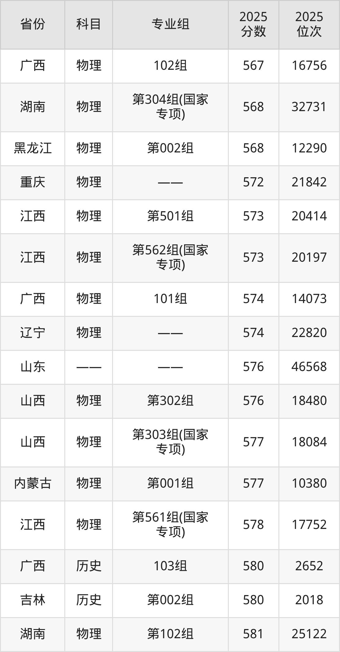 历史类:2025年中国矿业大学(北京)录取最低分是580分(广西),对应的位次排名是2652名。