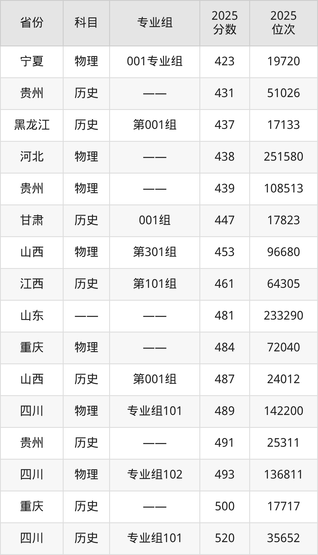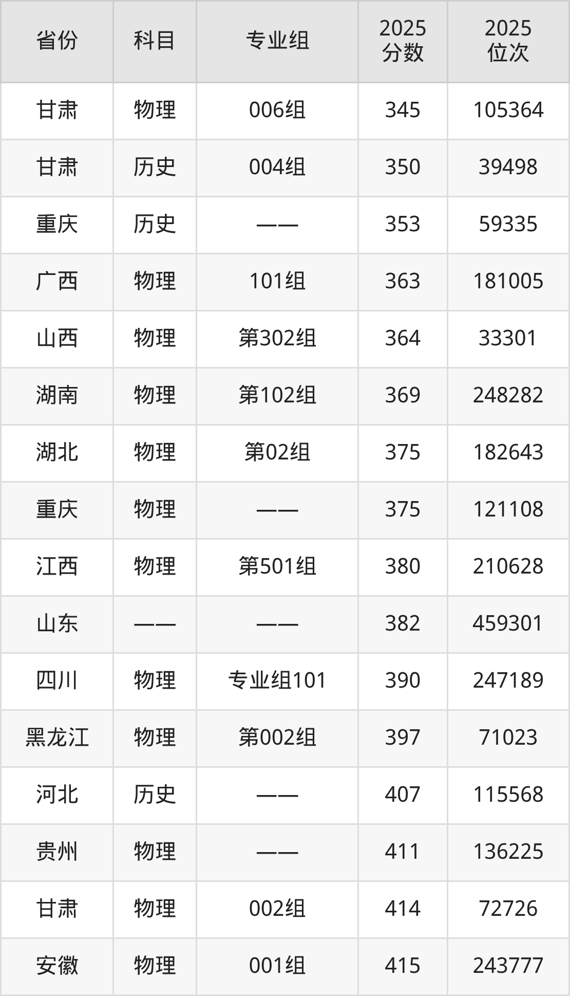 3+3地区:2025年酒泉职业技术大学录取最低分是382分(山东),对应的位次排名是459301名。