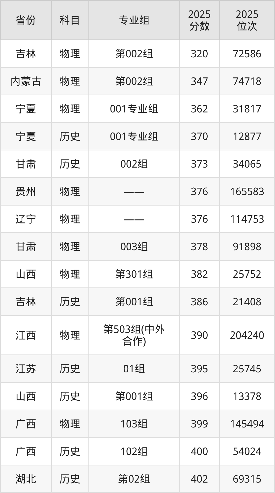 物理类:2025年江西职业技术大学录取最低分是320分(吉林),对应的位次排名是72586名。