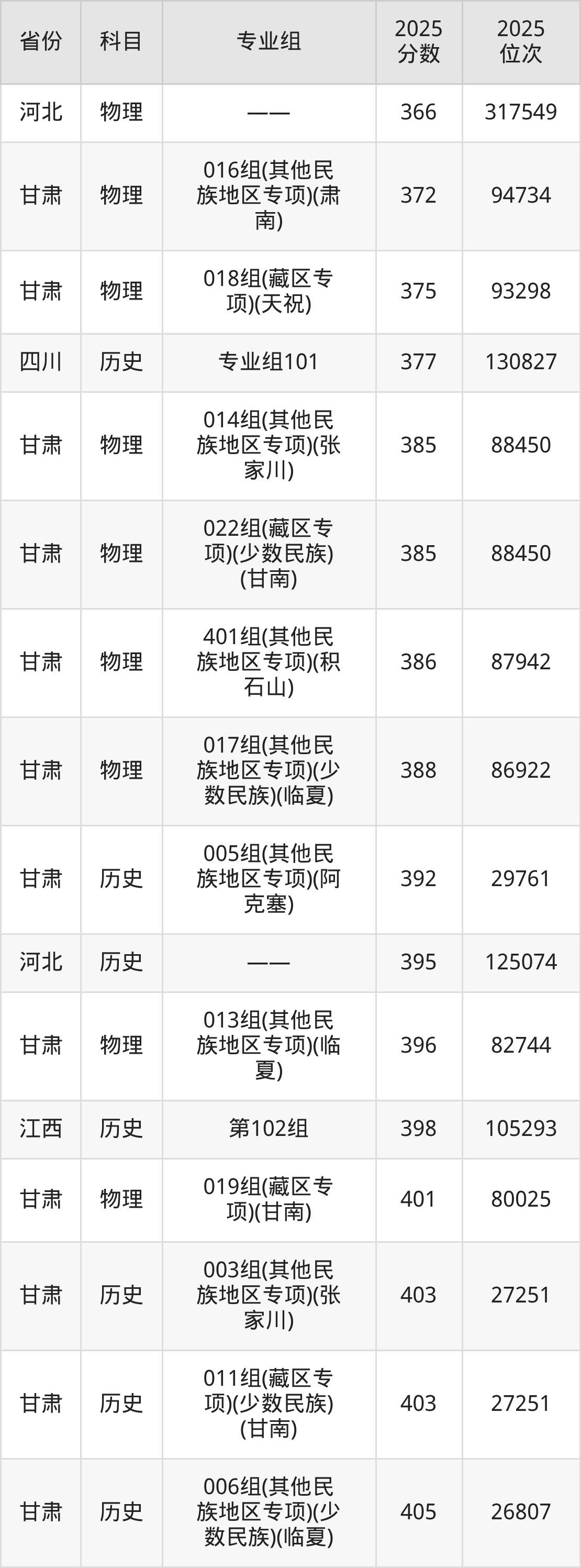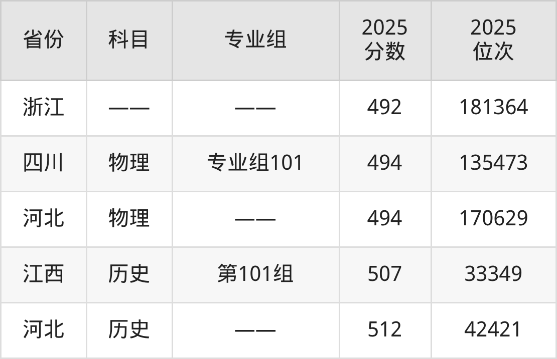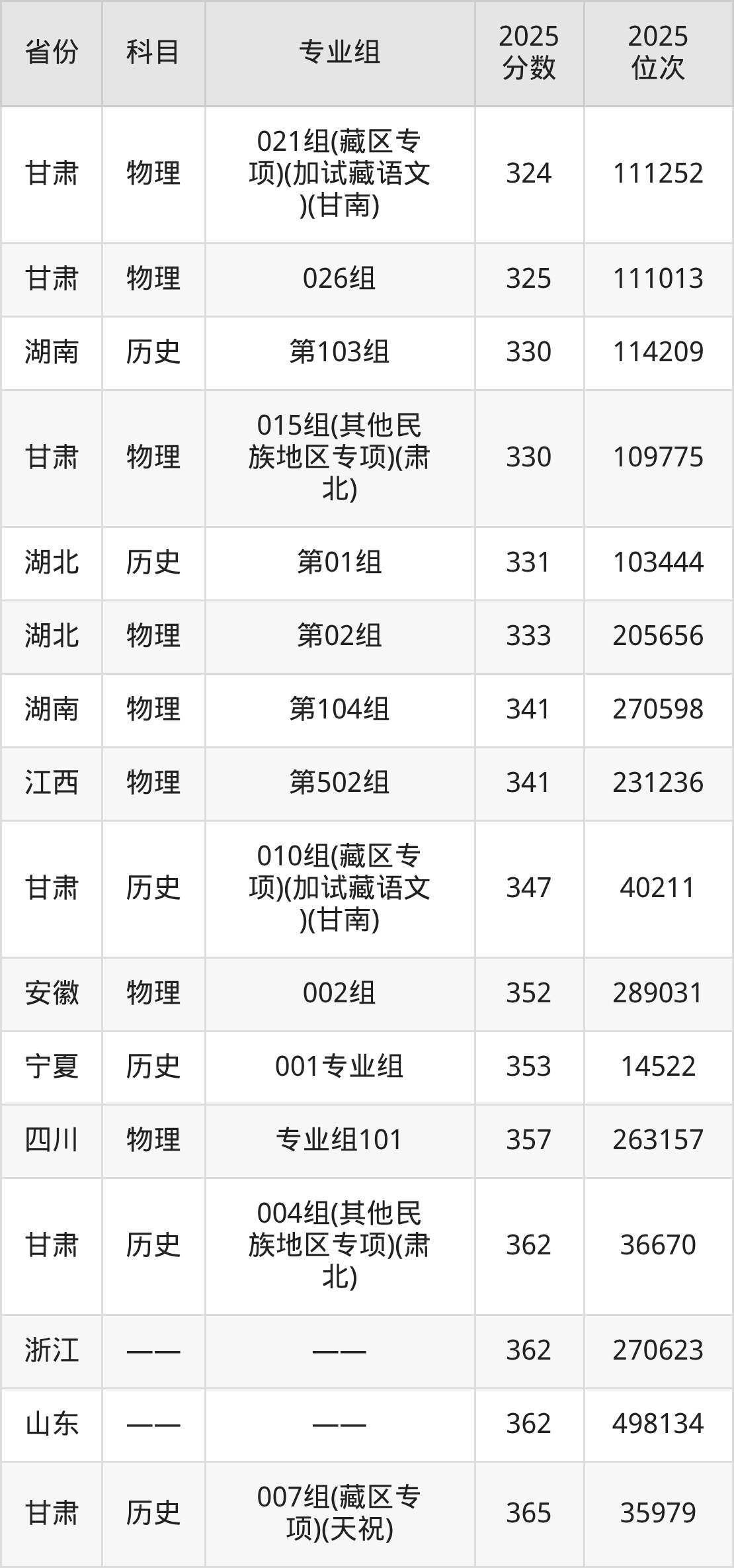 3+3地区:2025年甘肃林业职业技术大学录取最低分是362分(浙江),对应的位次排名是270623名。