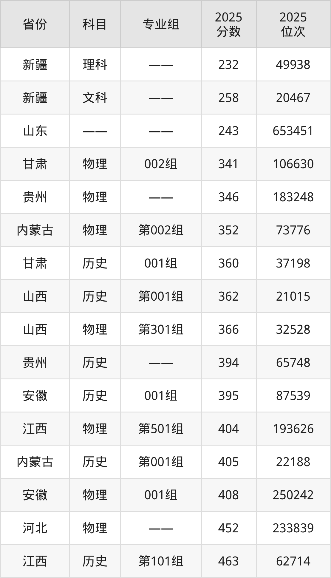物理类:2025年山东科技职业学院录取最低分是341分(甘肃),对应的位次排名是106630名。
