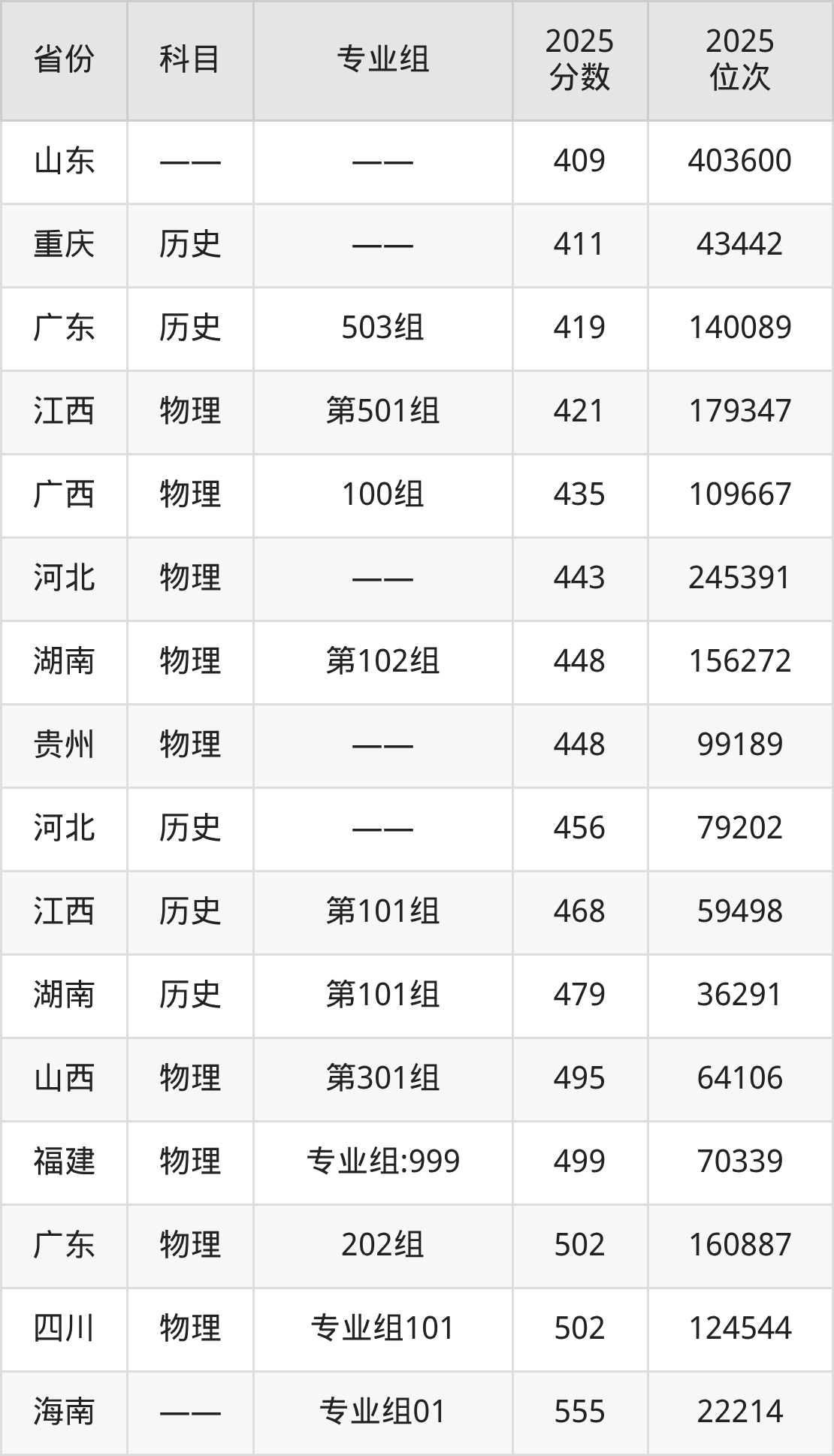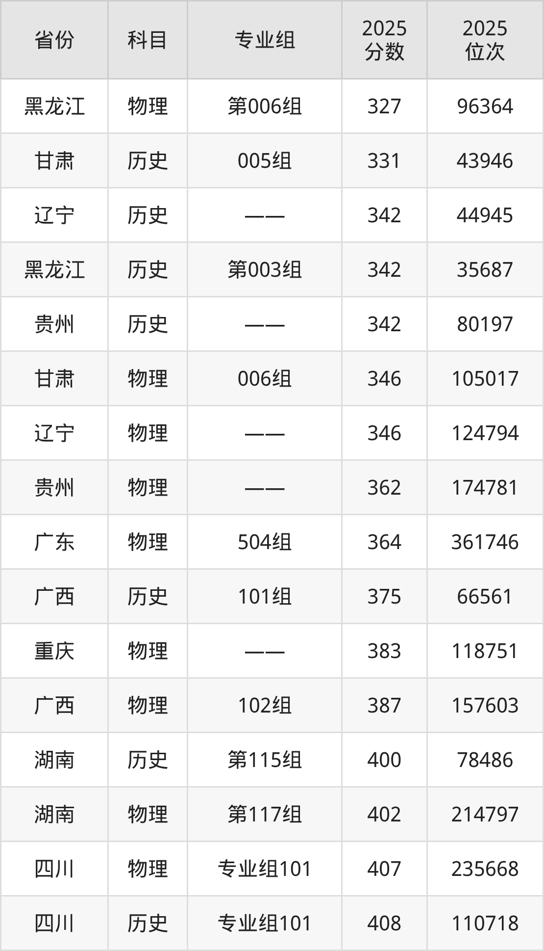 物理类:2025年湖南汽车工程职业大学省内录取最低分是402分,对应的位次排名是214797名。建议:如果2026年排名超过214797名,那么被该校录取的概率较大。