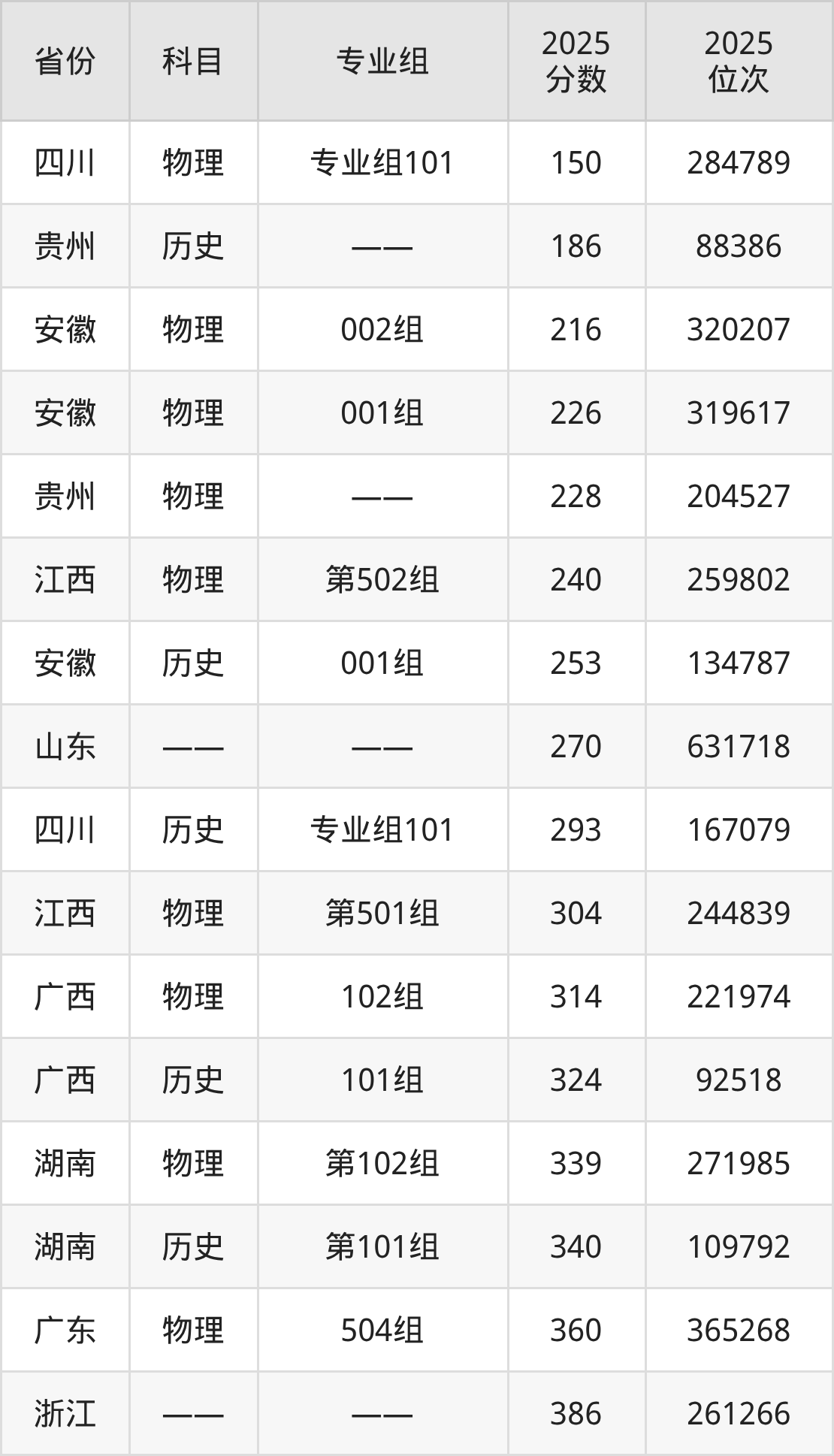 物理类:2025年广西金融职业技术学院录取最低分是150分(四川),对应的位次排名是284789名。