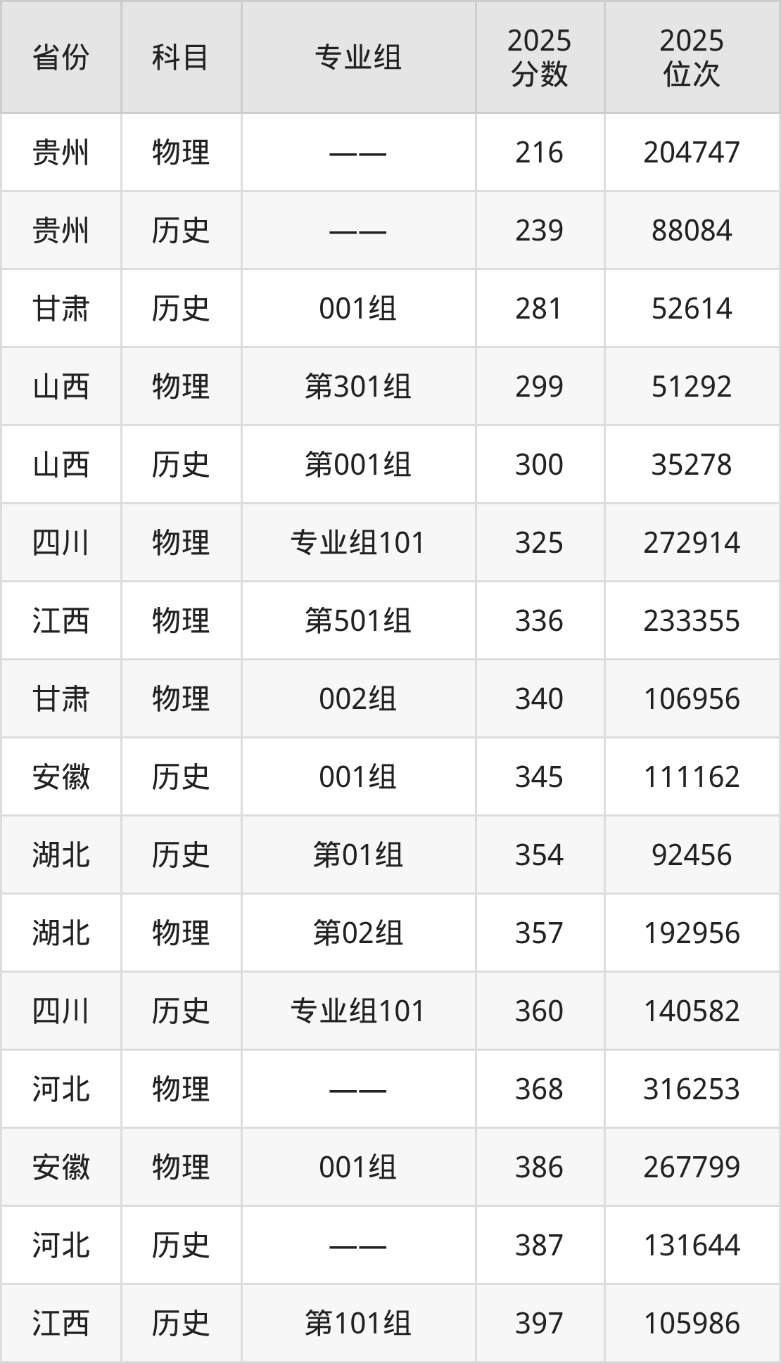 物理类:2025年天门职业学院录取最低分是216分(贵州),对应的位次排名是204747名。