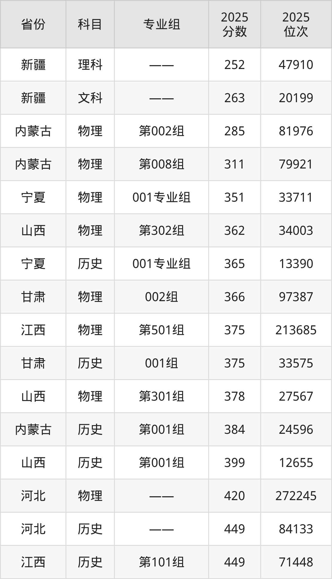 理科:2025年乌兰察布医学高等专科学校录取最低分是252分(新疆),对应的位次排名是47910名。