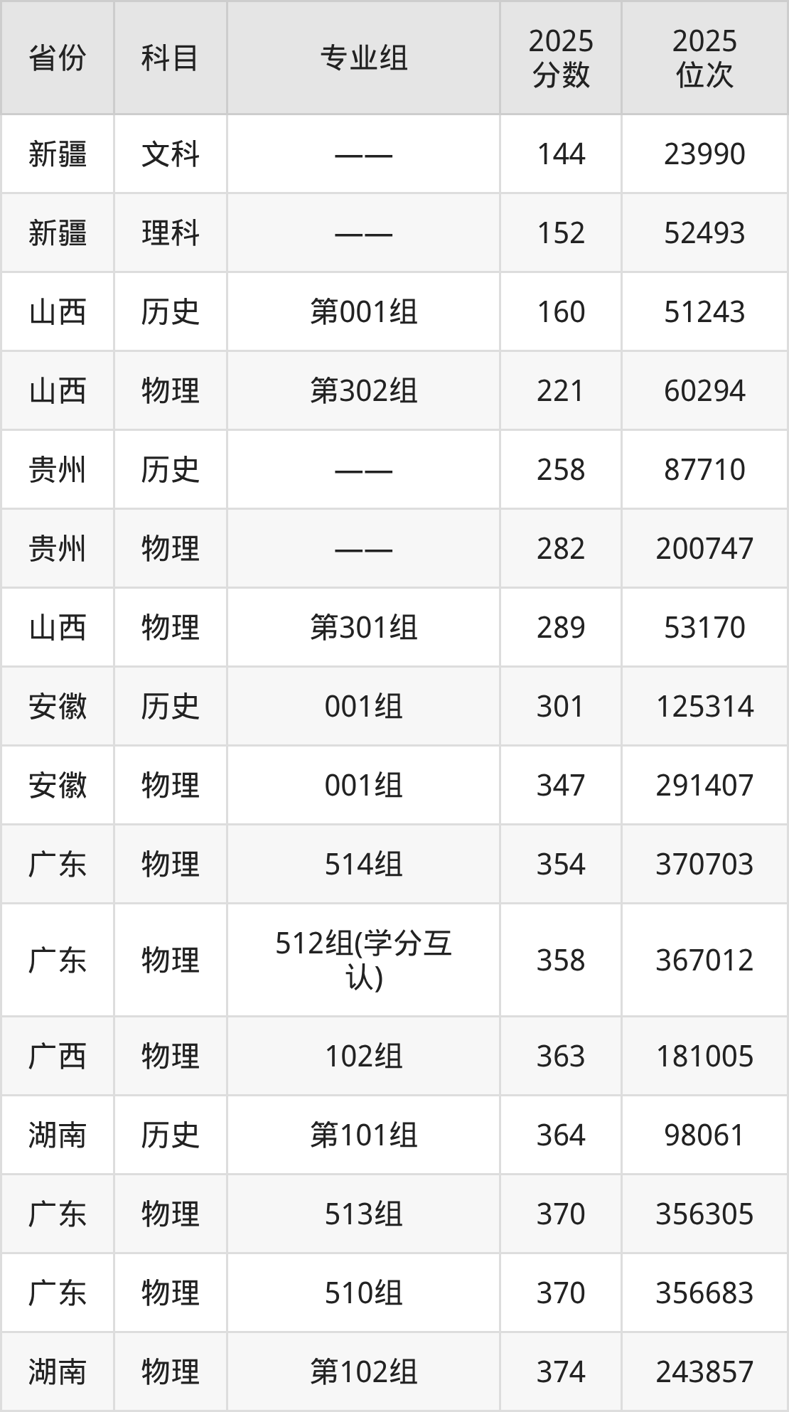 理科:2025年河源职业技术学院录取最低分是152分(新疆),对应的位次排名是52493名。