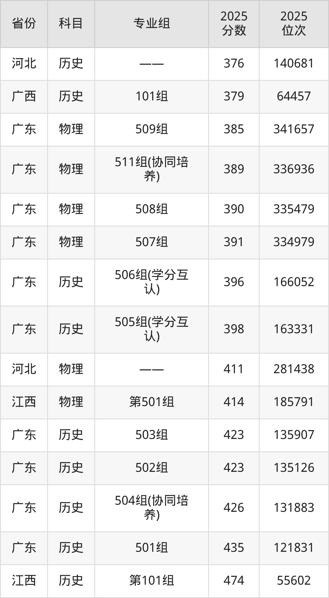 历史类:2025年河源职业技术学院省内录取最低分是396分,对应的位次排名是166052名。建议:如果2026年排名超过166052名,那么被该校录取的概率较大。