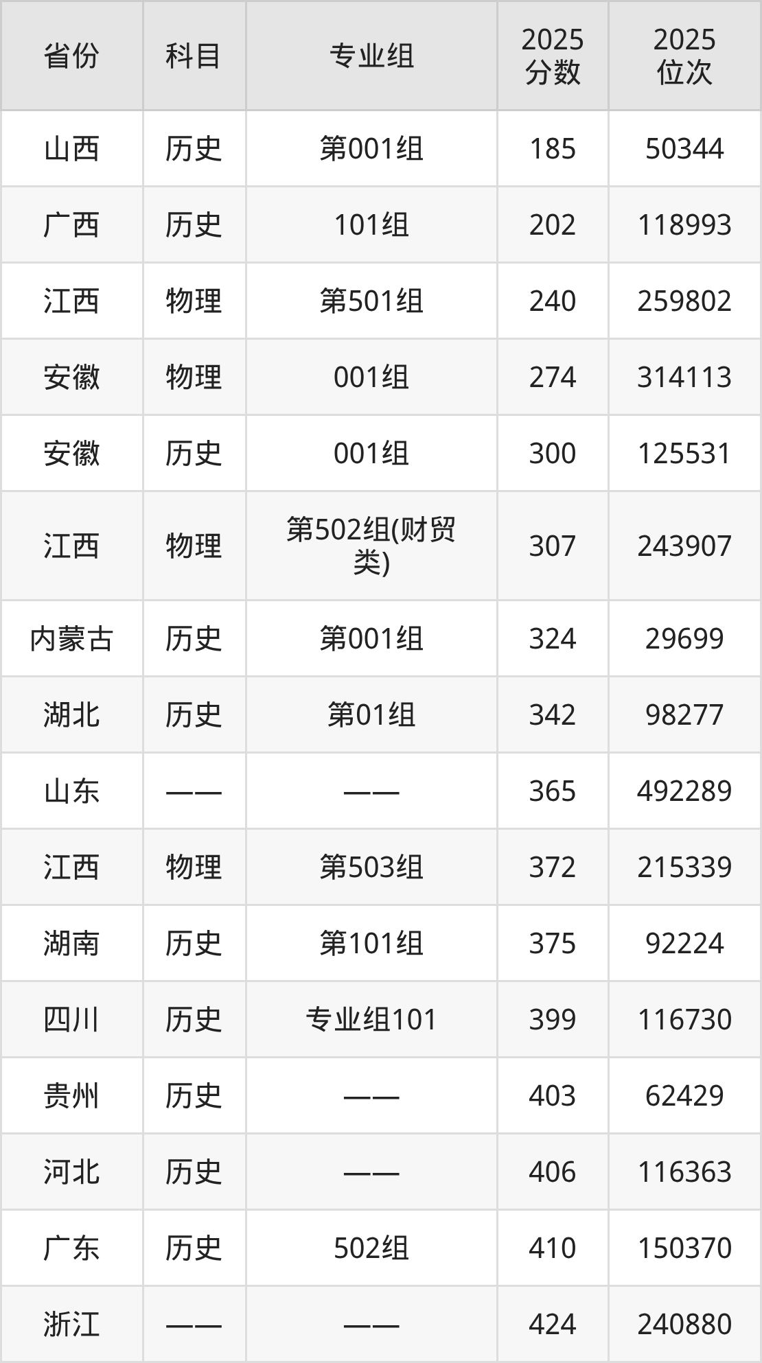 3+3地区:2025年江西外语外贸职业学院录取最低分是365分(山东),对应的位次排名是492289名。