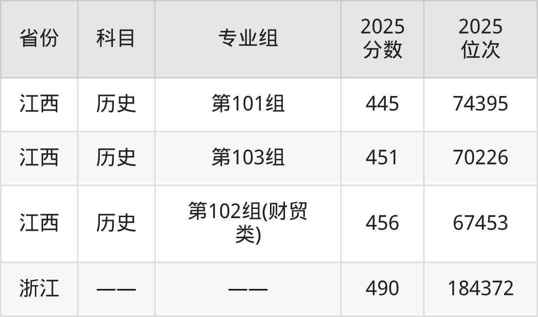 历史类:2025年江西外语外贸职业学院省内录取最低分是445分,对应的位次排名是74395名。建议:如果2026年排名超过74395名,那么被该校录取的概率较大。