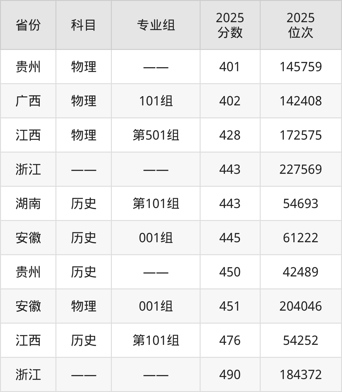 物理类:2025年嘉兴职业技术学院录取最低分是401分(贵州),对应的位次排名是145759名。